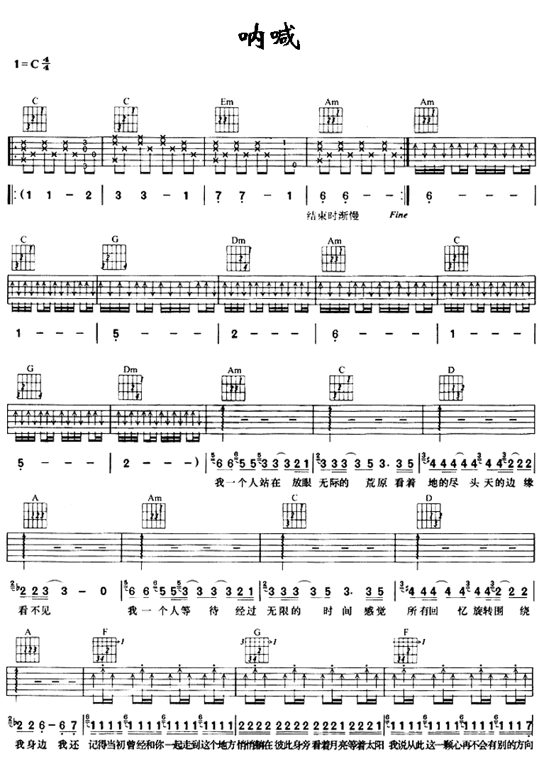 曲谱介绍: 《呐喊》吉他弹唱谱,共有2张高清图谱,免翻页排版设计。