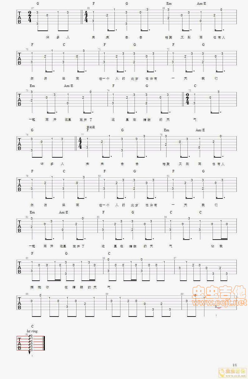 曲谱介绍: 《一个人的北京》吉他弹唱谱,共有4张高清图谱。
