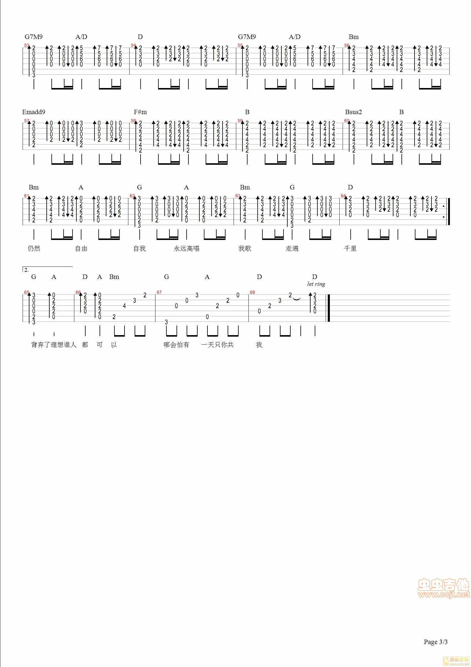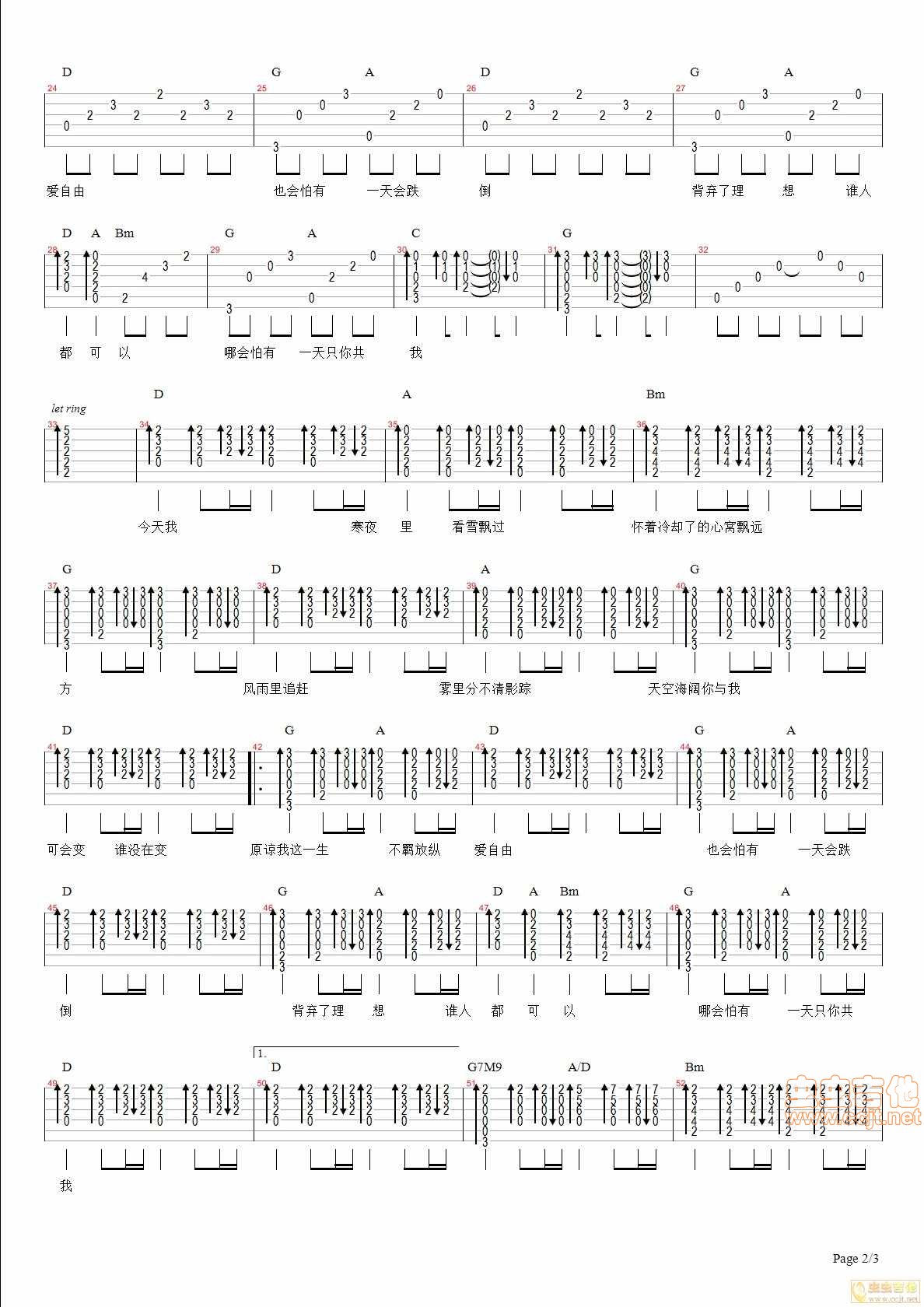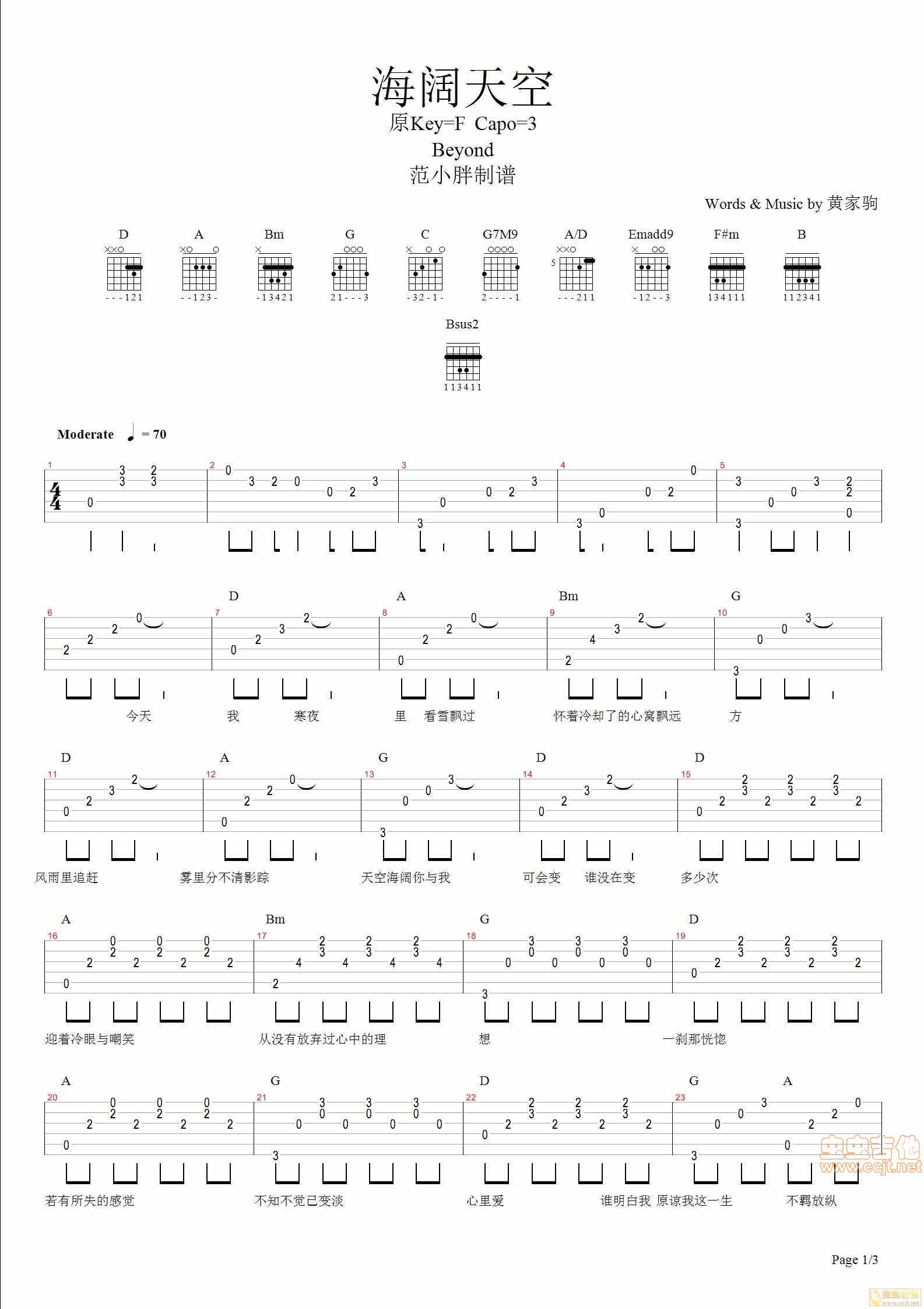 曲谱介绍: 《海阔天空》吉他弹唱谱,共有3张高清图谱。