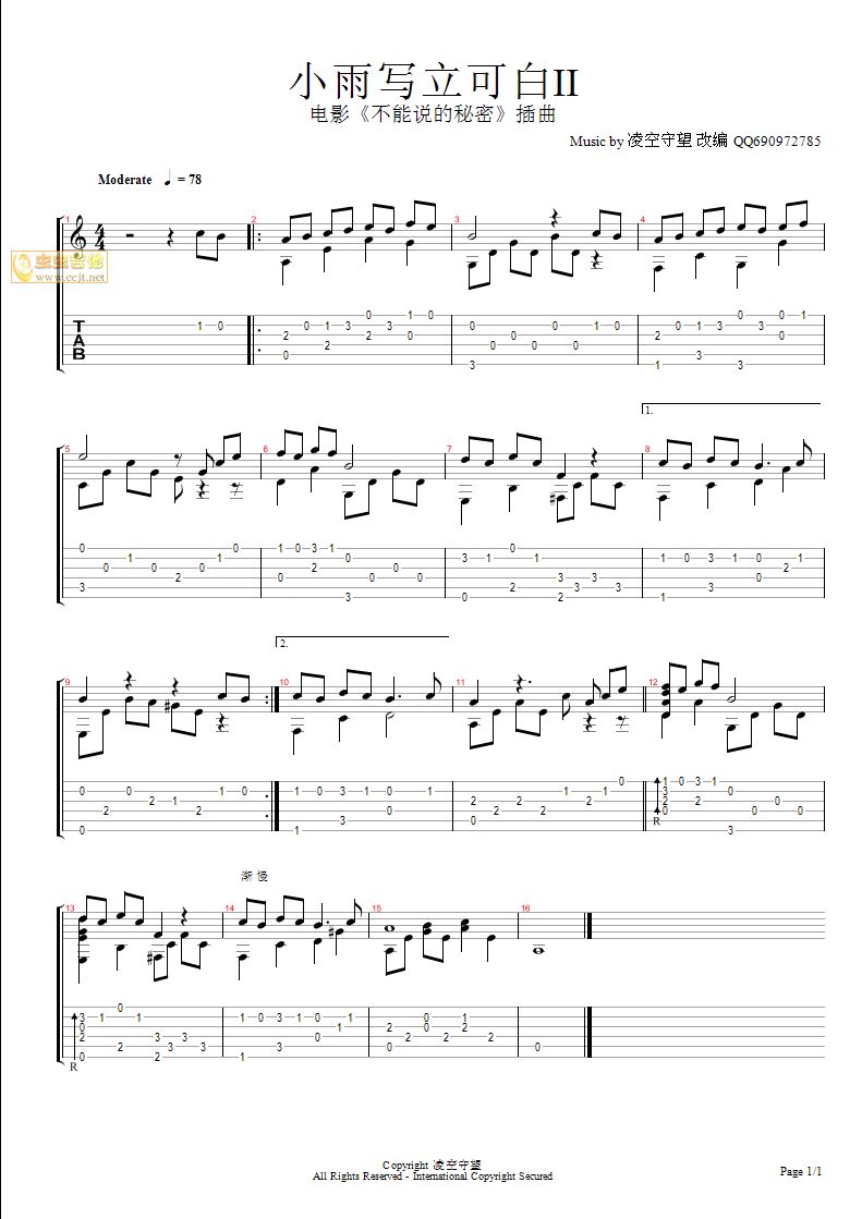 曲谱介绍: 小雨写立可白II|《不能说的秘密》吉他弹唱谱,共有1张高清图谱,免翻页排版设计。