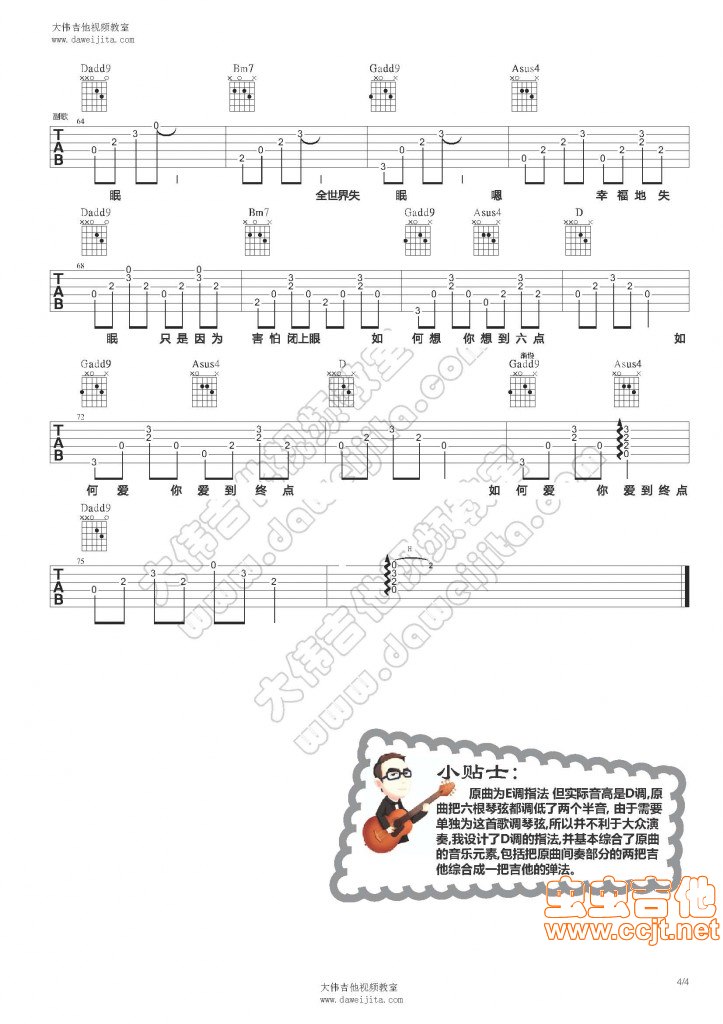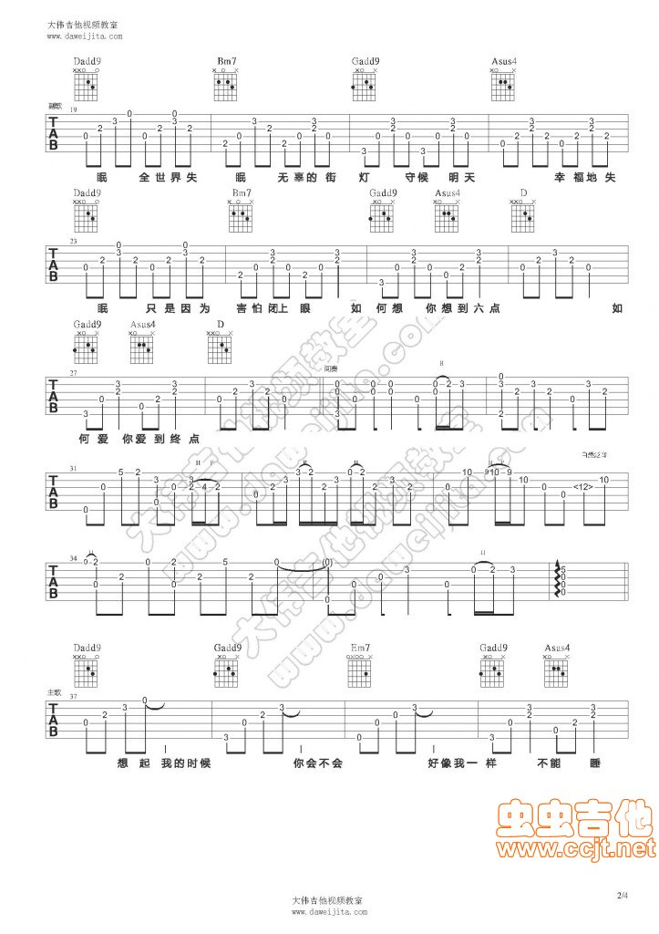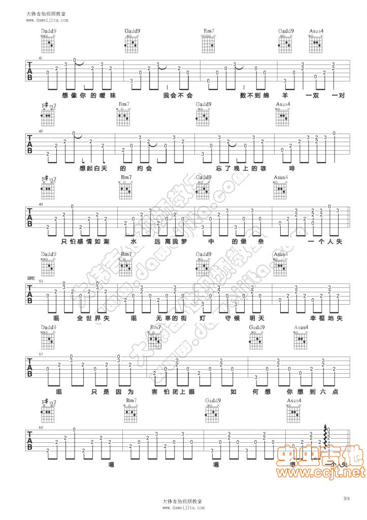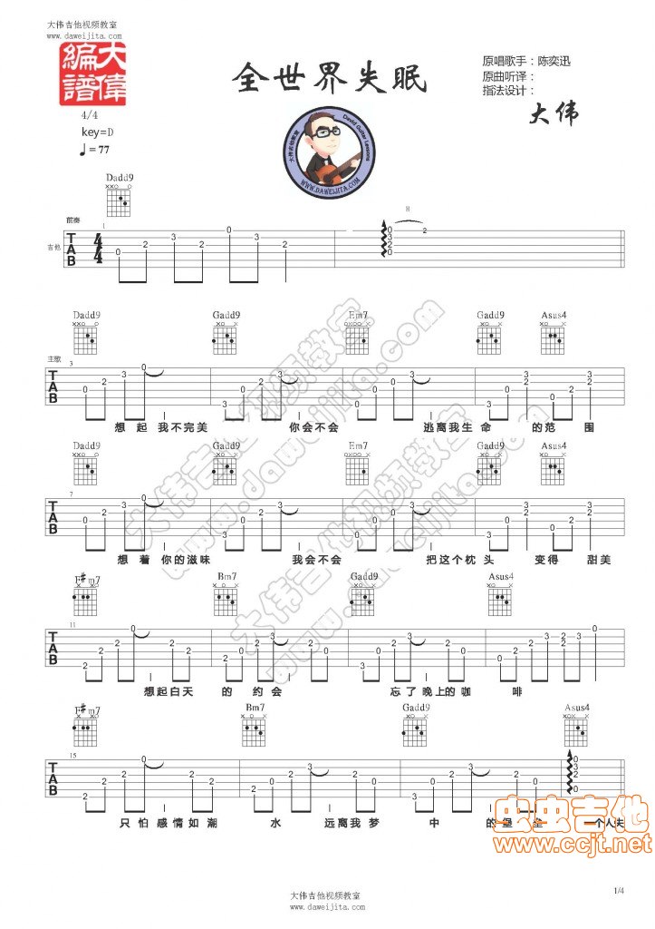 曲谱介绍: 分享陈奕迅的《全世界失眠》吉他弹唱谱,共有4张高清图谱。