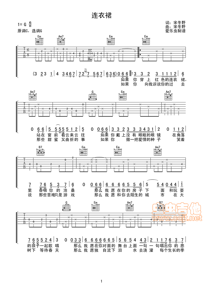 曲谱介绍: 《连衣裙》吉他弹唱谱,共有2张高清图谱,免翻页排版设计。