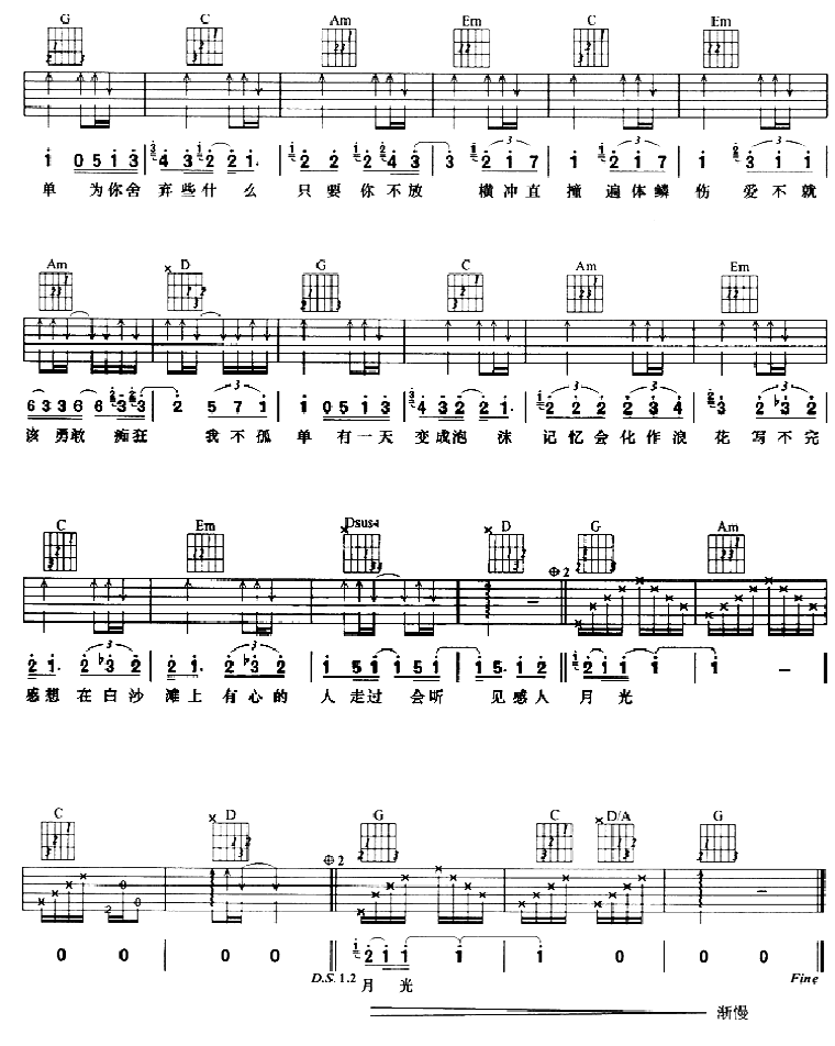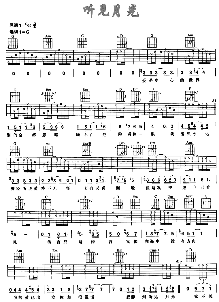曲谱介绍: 《听见月光》吉他弹唱谱,共有2张高清图谱,免翻页排版设计。