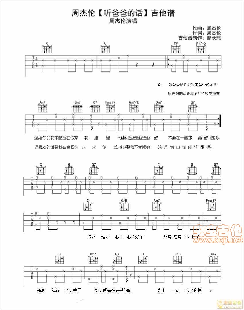 周杰伦【听爸爸的话】吉他六线吉他谱 - 吉他弹唱谱