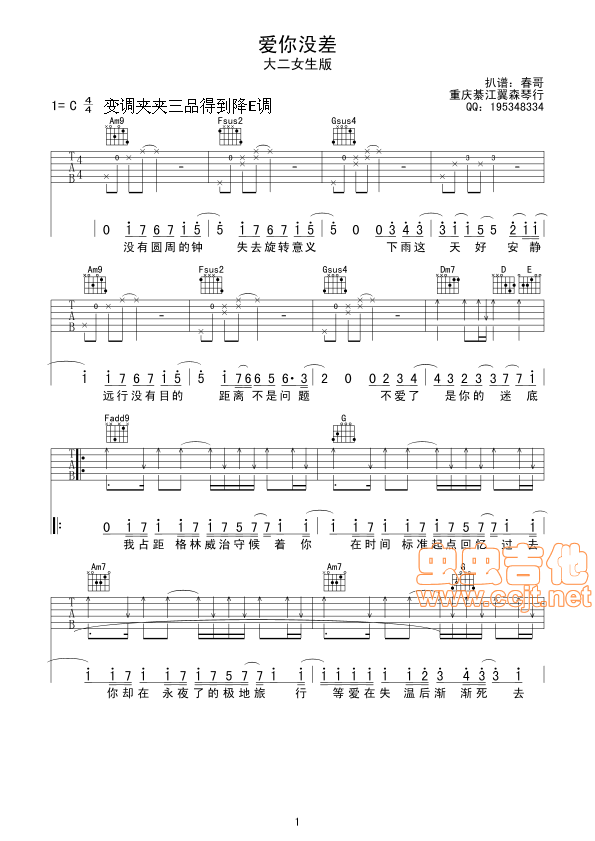 <爱你没差>大二女生版吉他谱 - 吉他弹唱谱