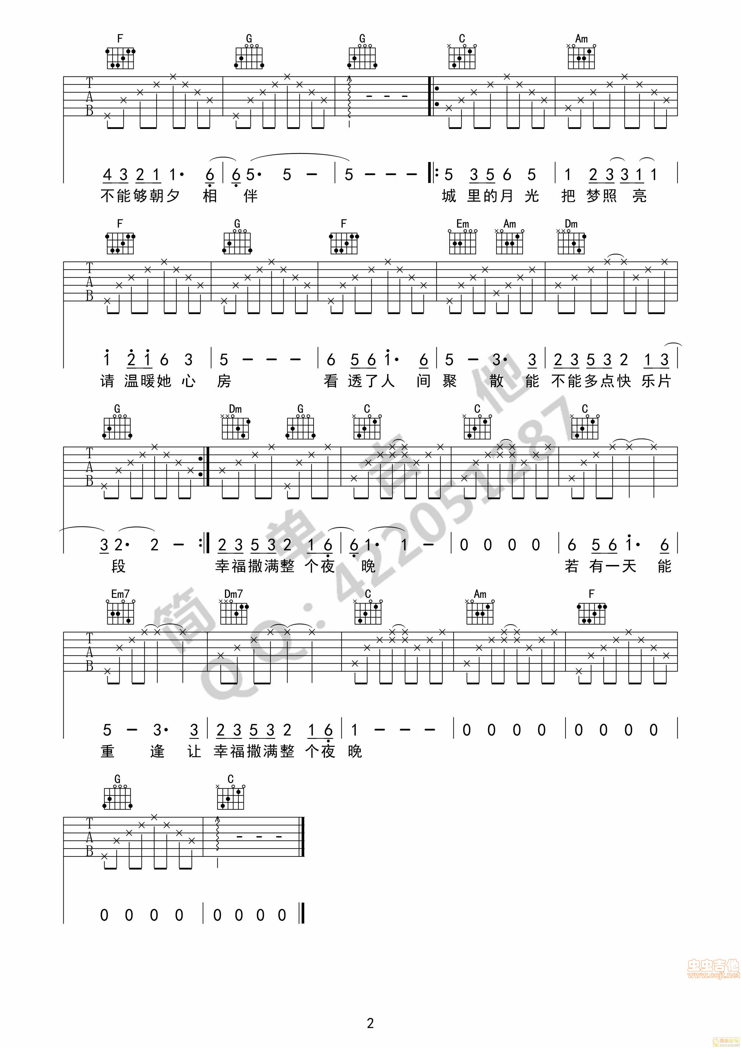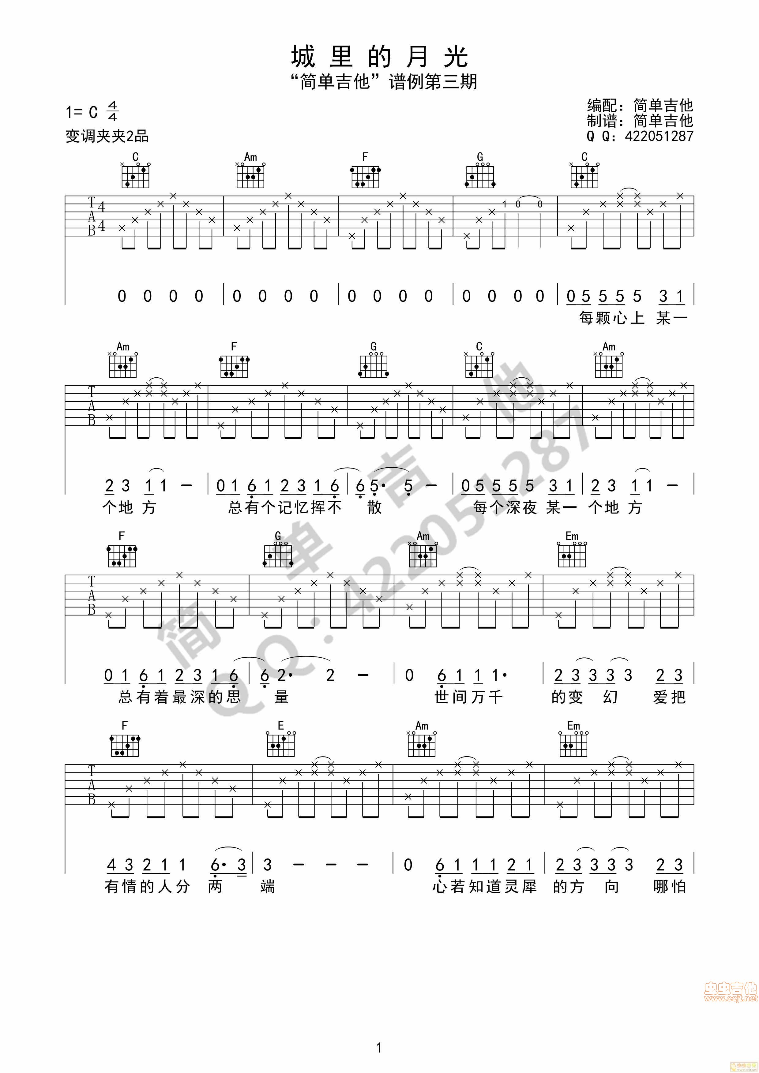 曲谱介绍: 《城里的月光》吉他弹唱谱,采用C调指法编配,共有2张高清图谱,免翻页排版设计。