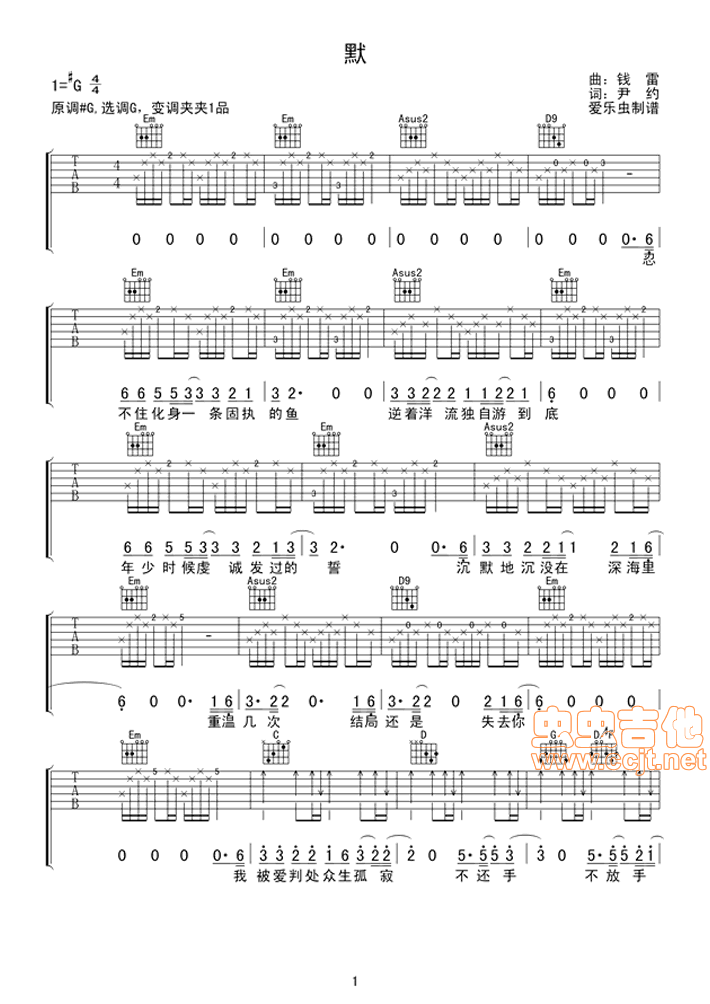 曲谱介绍: 《默(那英)》吉他弹唱谱,共有2张高清图谱,免翻页排版设计。