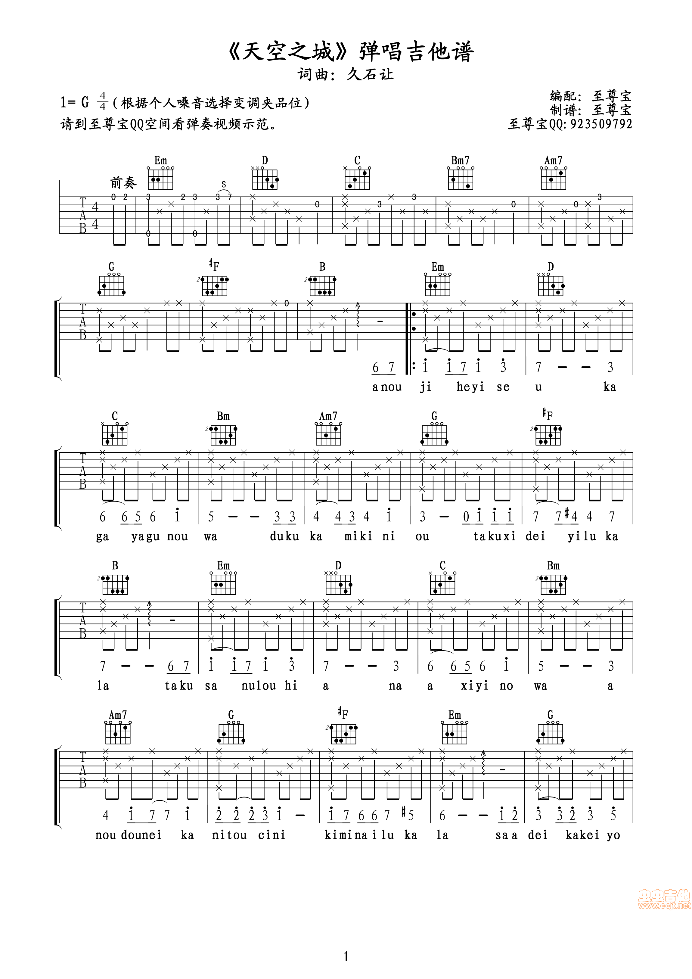曲谱介绍: 《天空之城》吉他弹唱谱,共有2张高清图谱,免翻页排版设计。