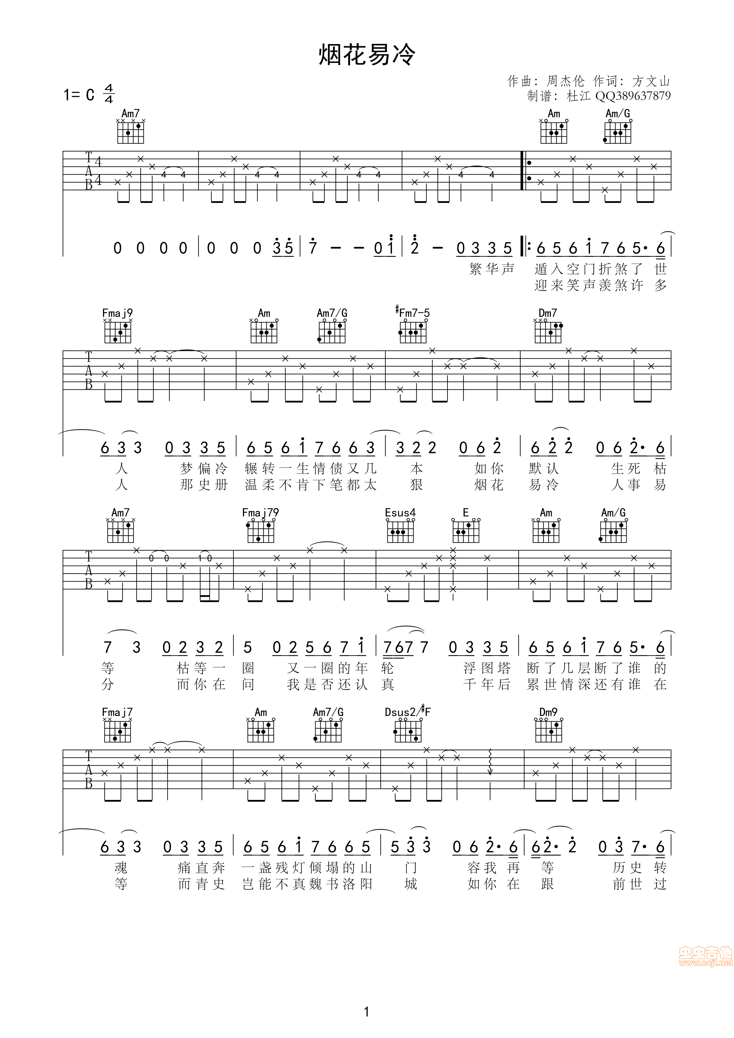 曲谱介绍: 《烟花易冷》吉他弹唱谱,共有3张高清图谱。