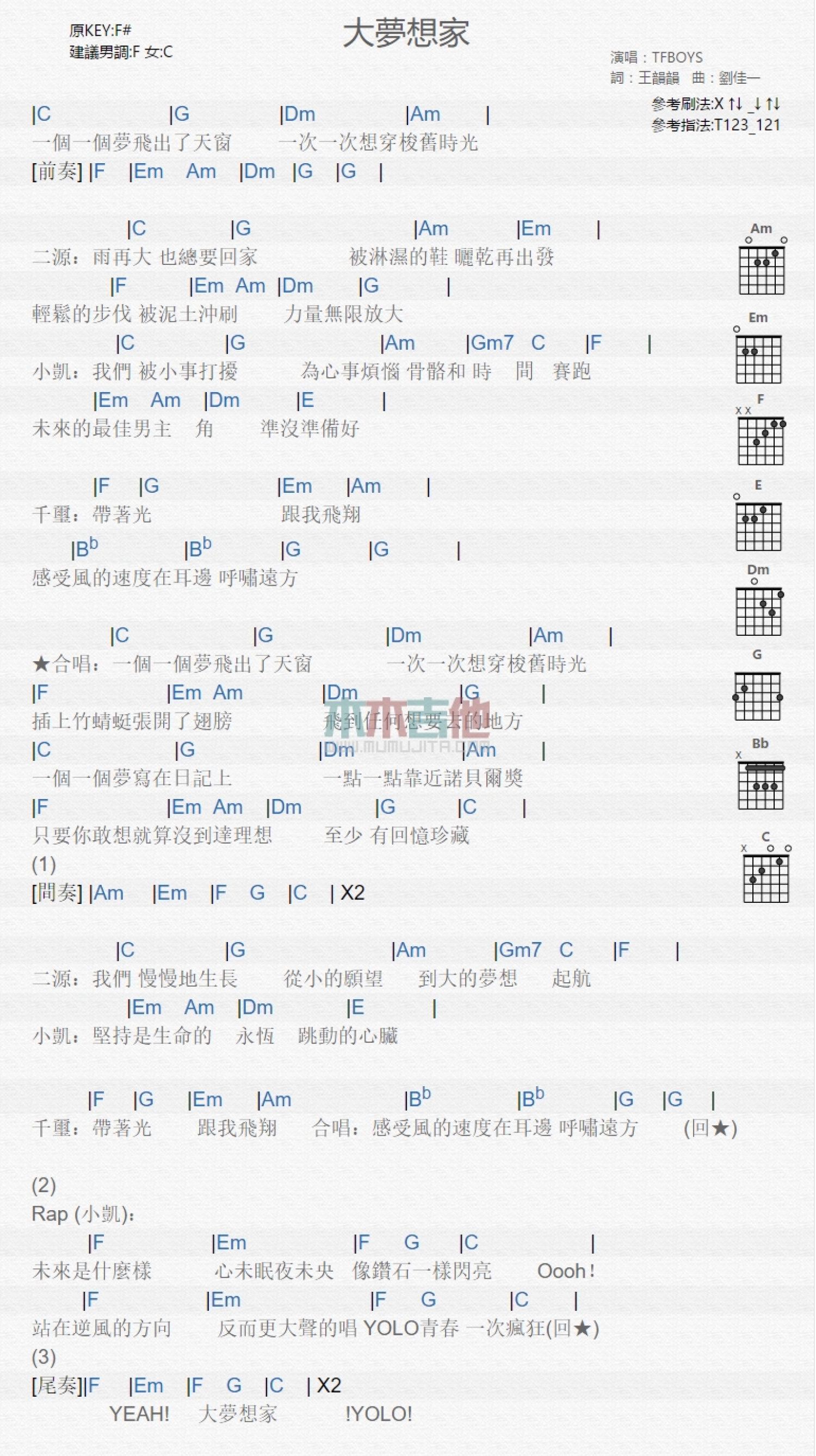 大梦想家吉他谱 - TFBOYS - C调吉他弹唱谱 - 简单版和弦谱