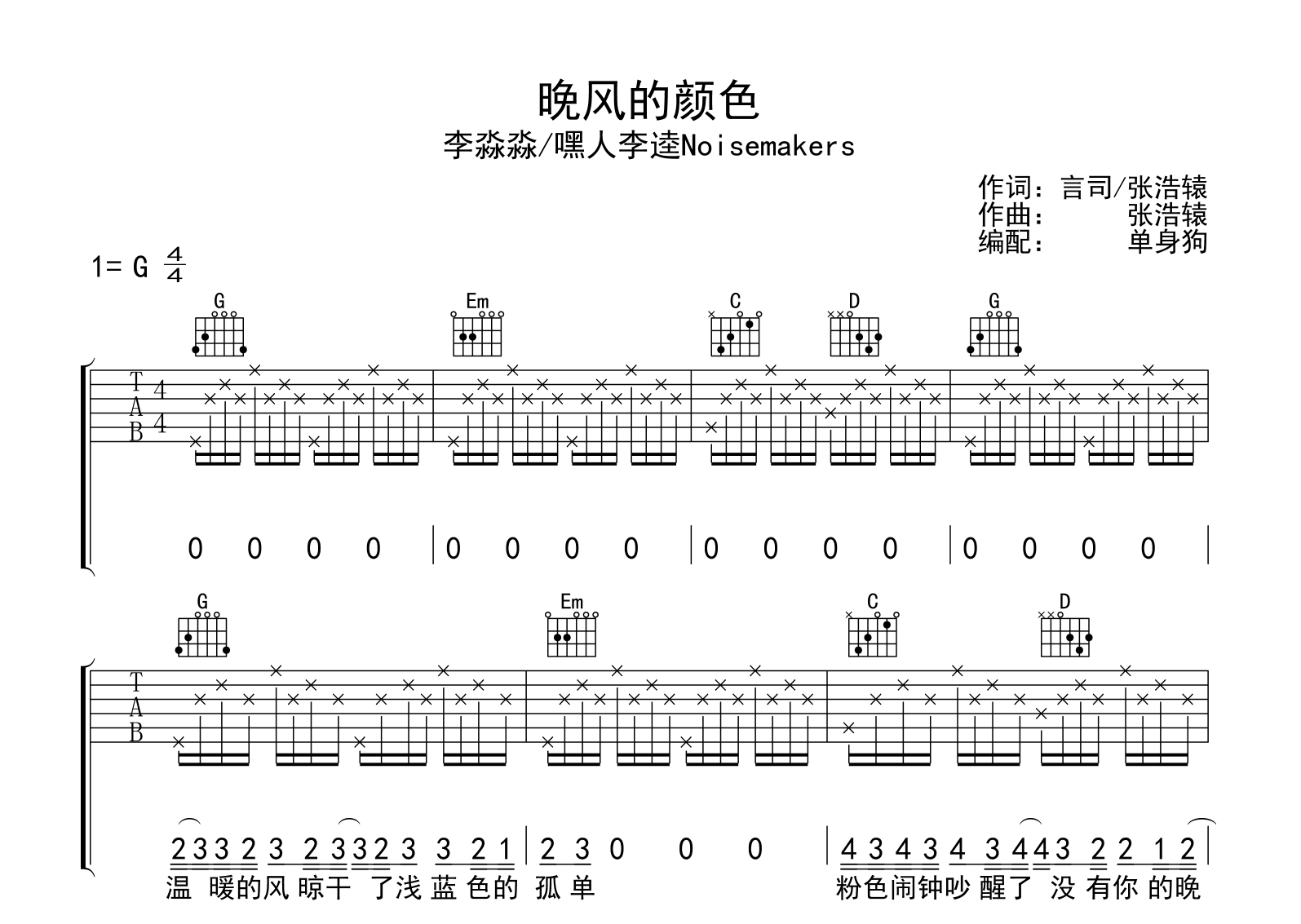 曲谱介绍: 晚风的颜色吉他谱,李淼淼/嘿人李逵演唱,《晚风的颜色》吉他弹唱六线谱,选用G调和弦指法,原调不夹变调夹,完整编配版本共四张高清图片谱例。