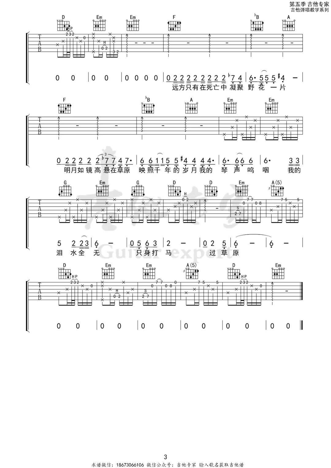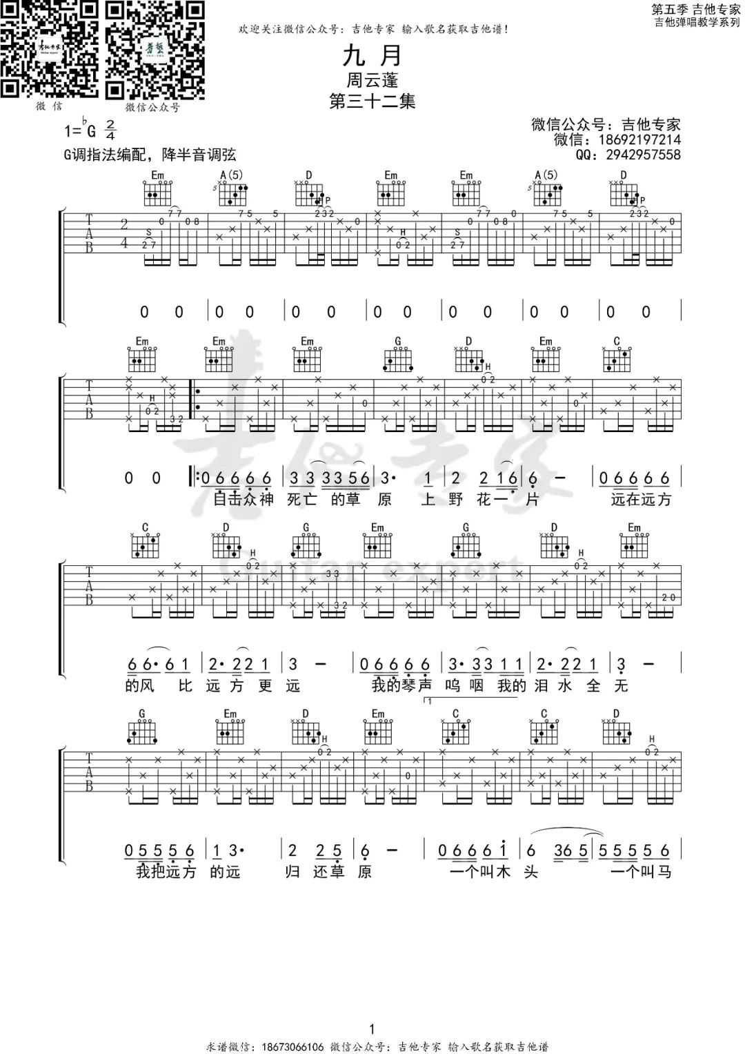 曲谱介绍: 吉他谱介绍:九月吉他谱,周云蓬演唱的一首歌曲,2/4拍的节奏,这首歌曲的原调为#F调,这里曲谱采用了G调指法进行编配,演唱时降半音调弦可回到原调,也可根据个人实际嗓音情况选择不降音或夹几品。曲谱由琴谱网更新上传,共3张高清图片弹唱吉他谱例,来源于@吉他专家编配出品。盲人歌手周云蓬演绎的这首歌,优美、孤寂、悲壮、忧伤,仿佛看到了海子走过草原孤独的身影,马头琴声在草原的天空飘荡着,飘向远方。