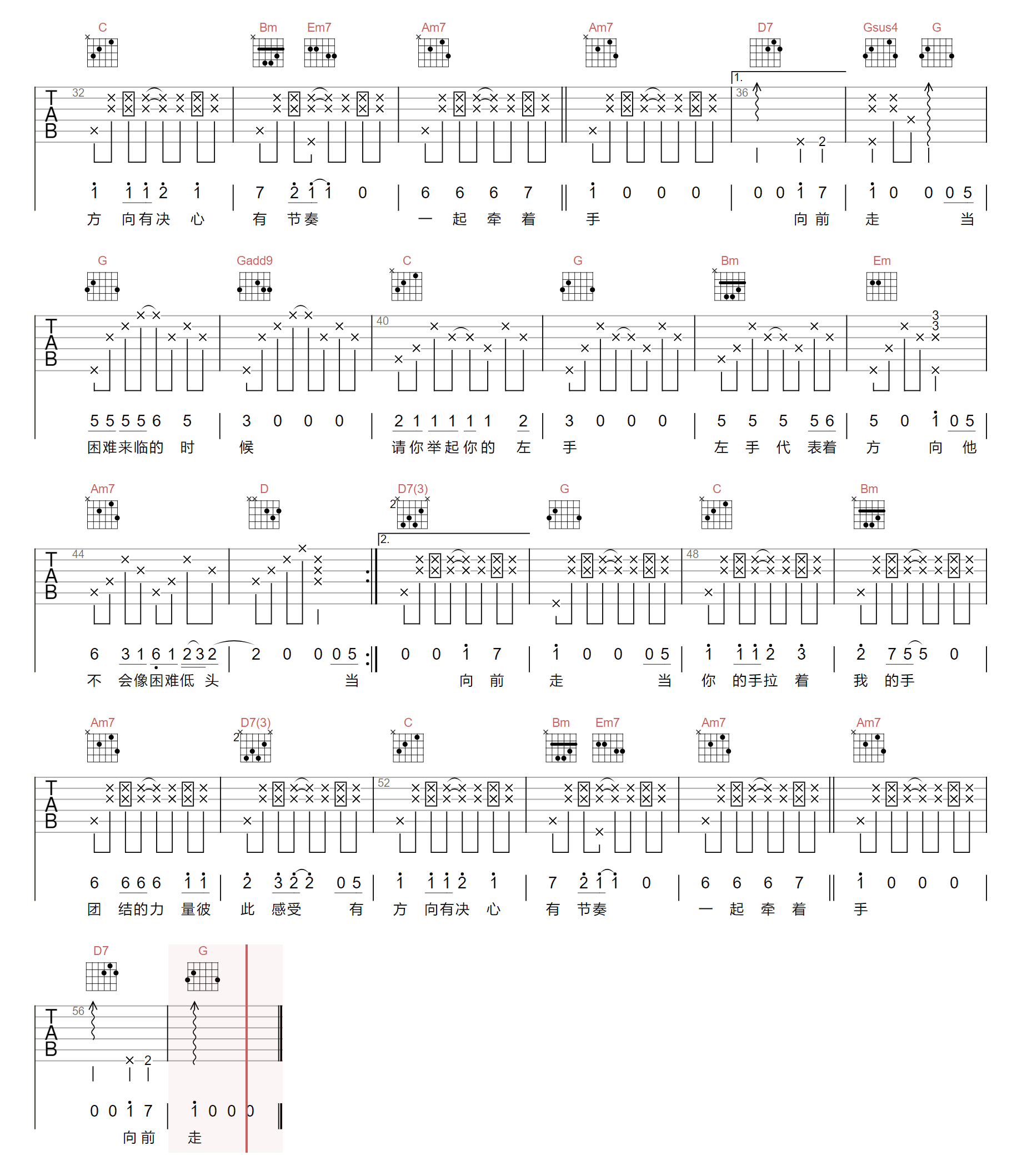 曲谱介绍: 吉他谱介绍:左手右手吉他谱,杨沛宜演唱的一首歌曲,4/4拍的节奏,这首歌曲的原调为降B调,这里曲谱采用了G调指法进行编配,演唱时夹变调夹3品可回到原调,也可根据个人实际嗓音情况选择。曲谱由琴谱网更新上传,共2张高清图片弹唱吉他谱例,来源于@亦落编配出品。这首歌旋律清新,歌词积极向上,给人力量。当面对困难,让我们一起找到方向,拥有决心,团结一心,手拉手,向前走。