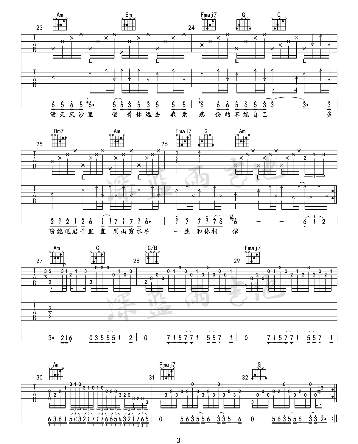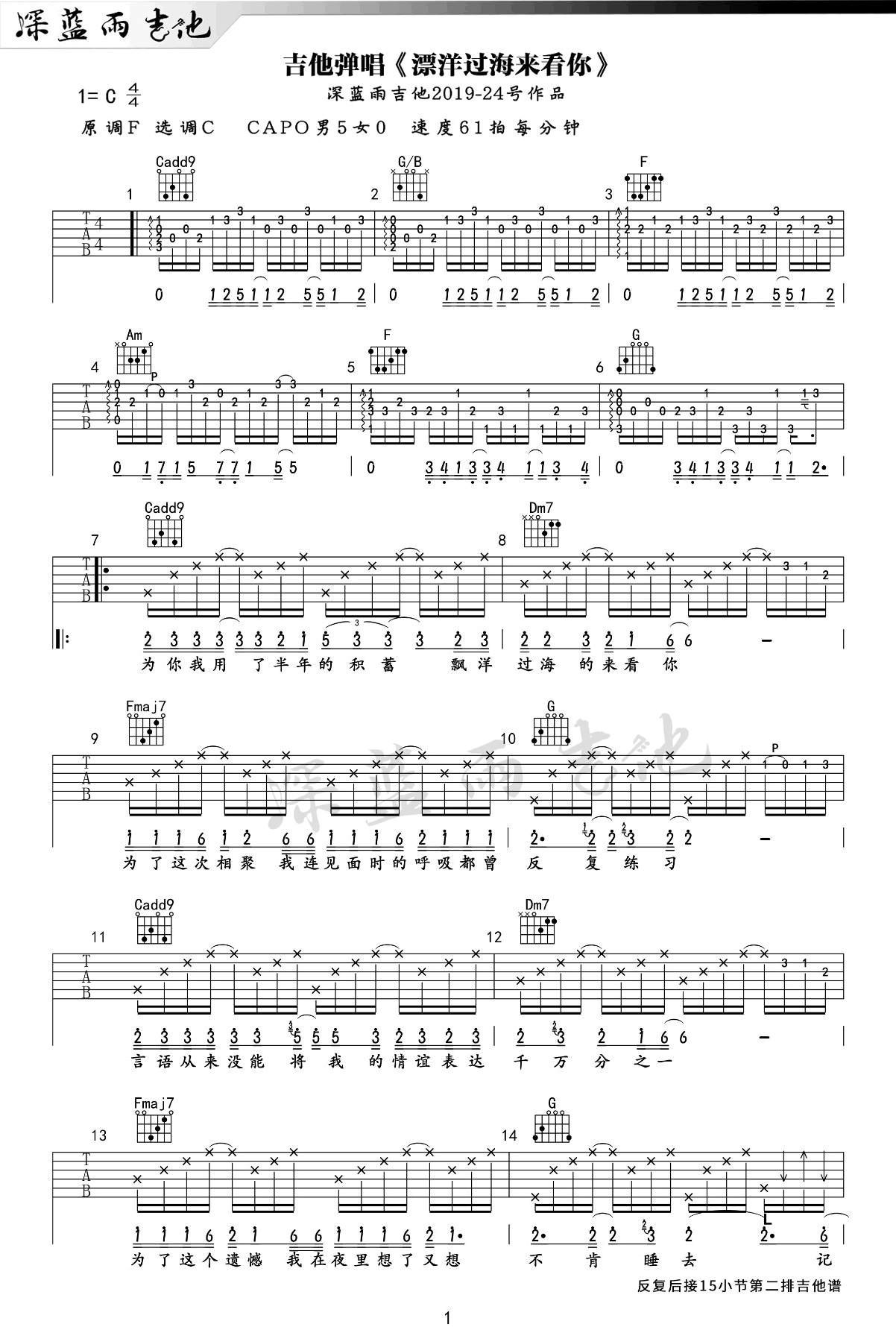 曲谱介绍: 吉他谱介绍:漂洋过海来看你吉他谱,李宗盛演唱的一首歌曲,4/4拍的节奏,这首歌曲的原调为F调,这里曲谱采用了C调指法进行编配,演唱时夹变调夹5品可回到原调,也可根据个人实际嗓音情况选择。曲谱由琴谱网更新上传,共3张高清图片弹唱吉他谱例,来源于@深蓝雨吉他编配出品。这是乐坛前辈李宗盛大哥的一首经典老歌,歌曲优美旋律、歌者亲身的体会和浓浓的情丝去演绎,注定让这首歌成为经典。 漂洋过海来看你吉他弹唱教学