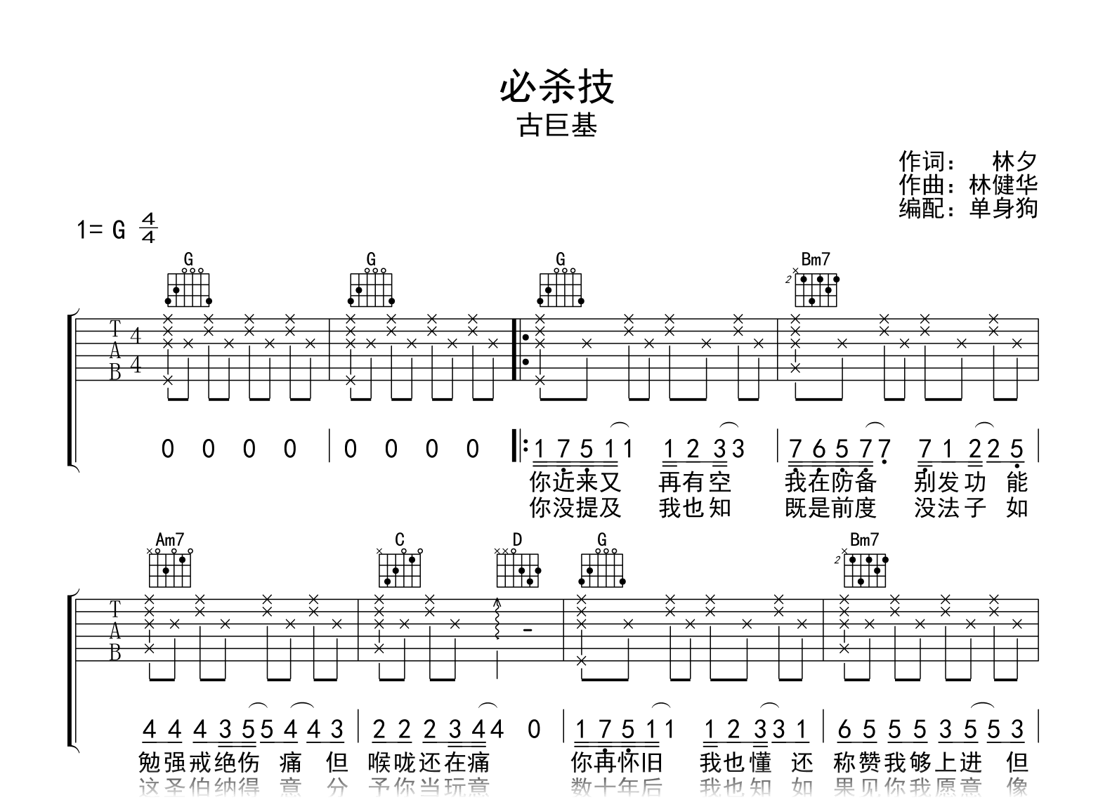 曲谱介绍: 古巨基《必杀技》吉他弹唱谱,采用G调指法编配,共有2张高清图谱,免翻页排版设计。