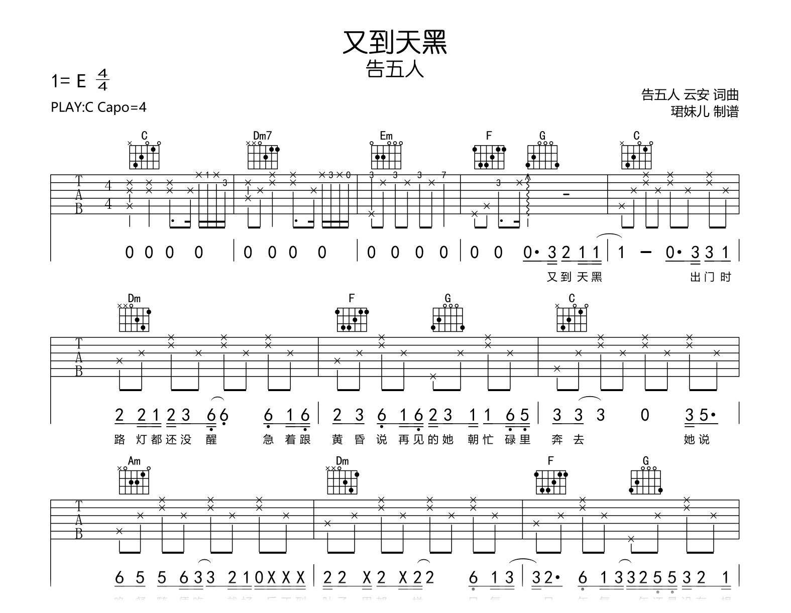 又到天黑吉他谱 - 告五人 - C调吉他弹唱谱