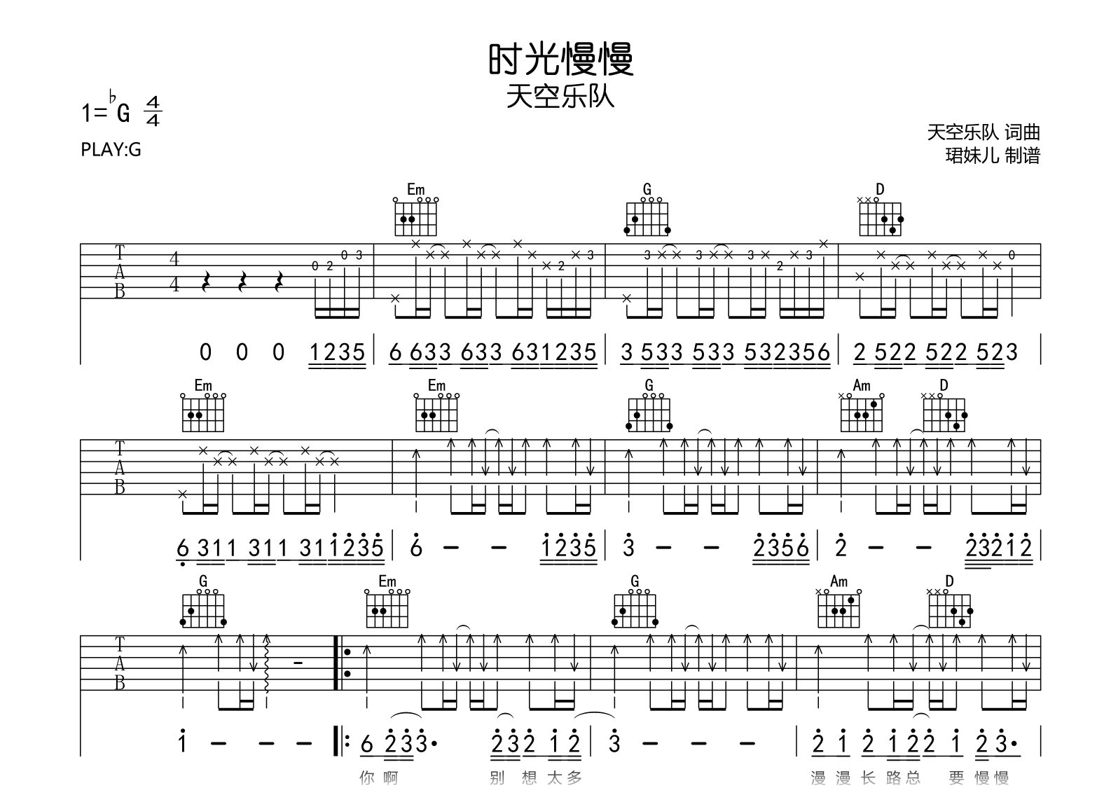时光慢慢吉他谱 - 天空乐队 - G调吉他弹唱谱