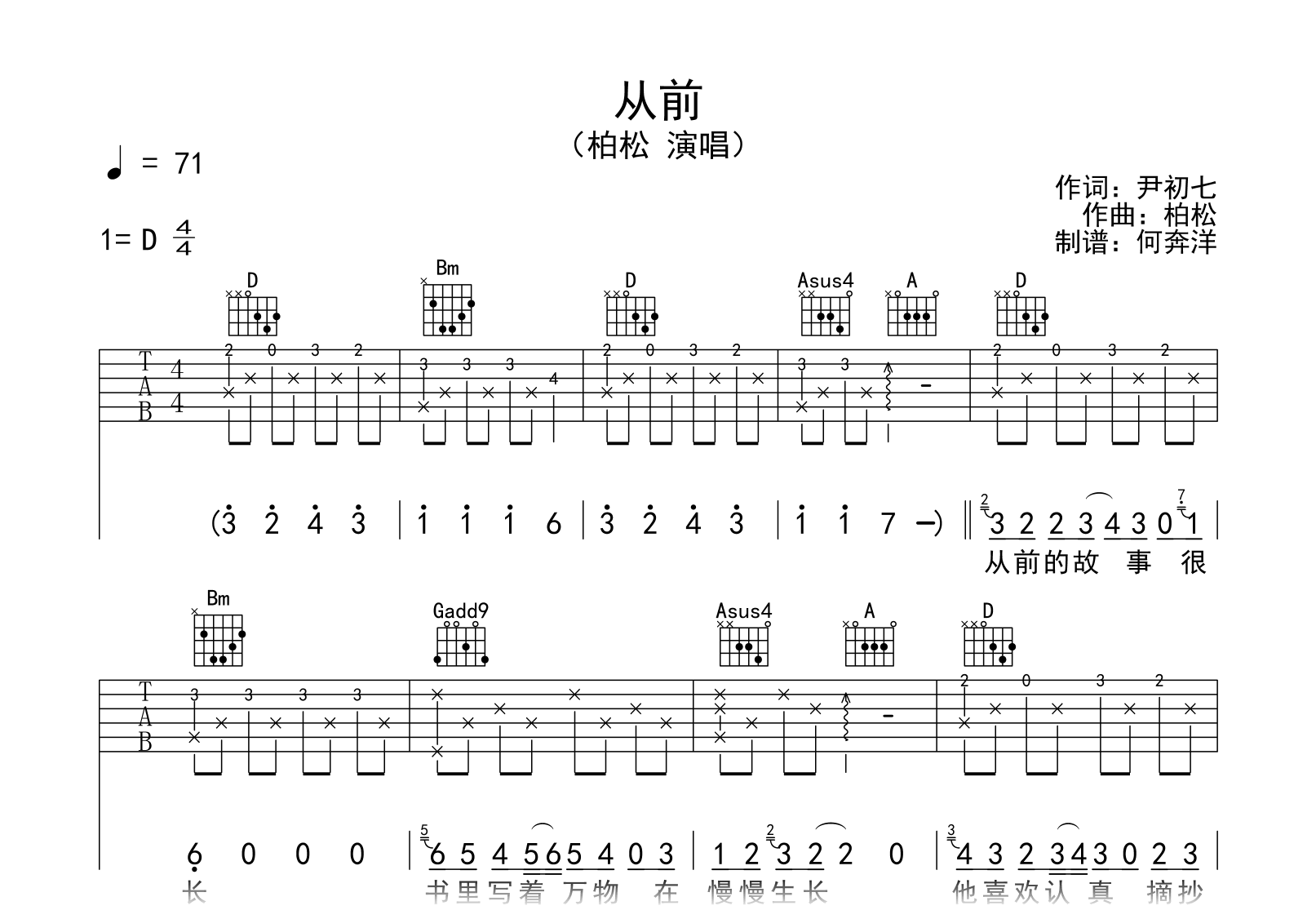 曲谱介绍: 柏松《从前》吉他弹唱谱原版,共有2张高清图谱,免翻页排版设计。