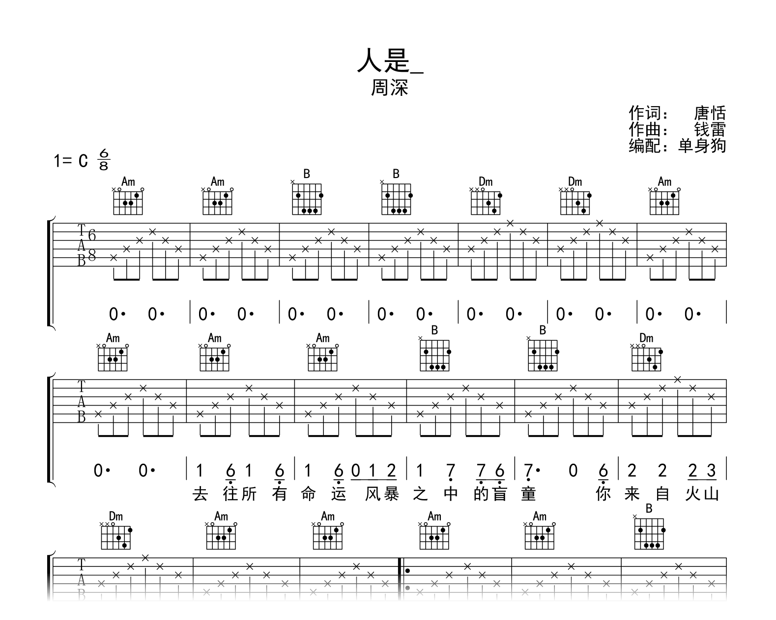 曲谱介绍: 周深《人是_》吉他弹唱谱,采用C调指法编配,共有2张高清图谱,免翻页排版设计。
