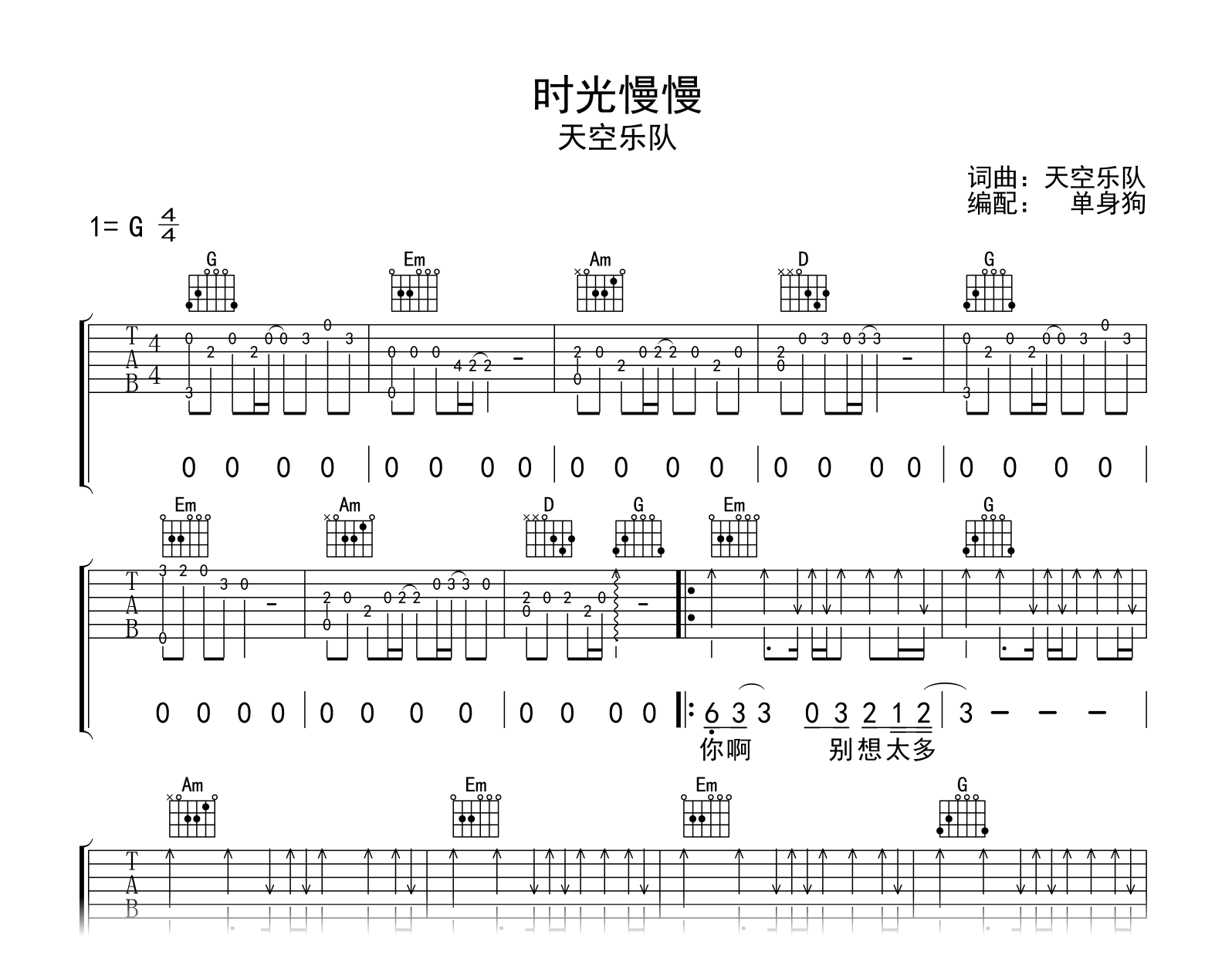 曲谱介绍: 天空乐队《时光慢慢》吉他弹唱谱,采用G调指法编配,共有2张高清图谱,免翻页排版设计。