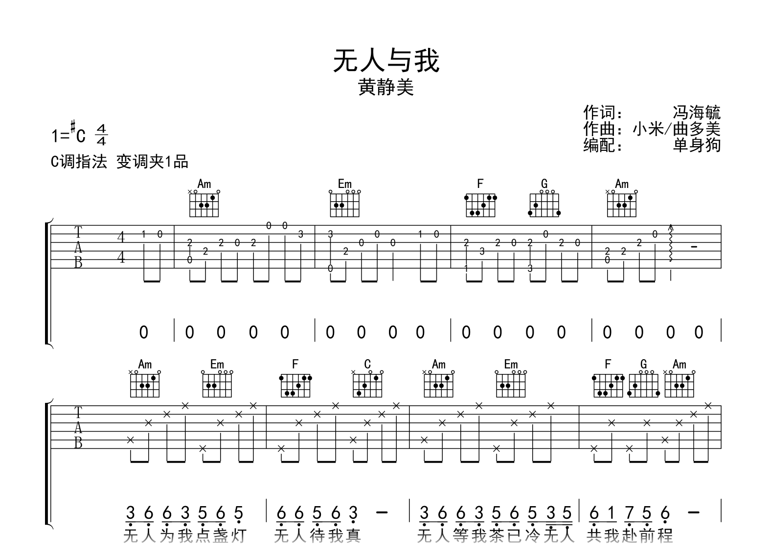 曲谱介绍: 黄静美《无人与我》吉他弹唱谱,采用C调指法编配,共有2张高清图谱,免翻页排版设计。