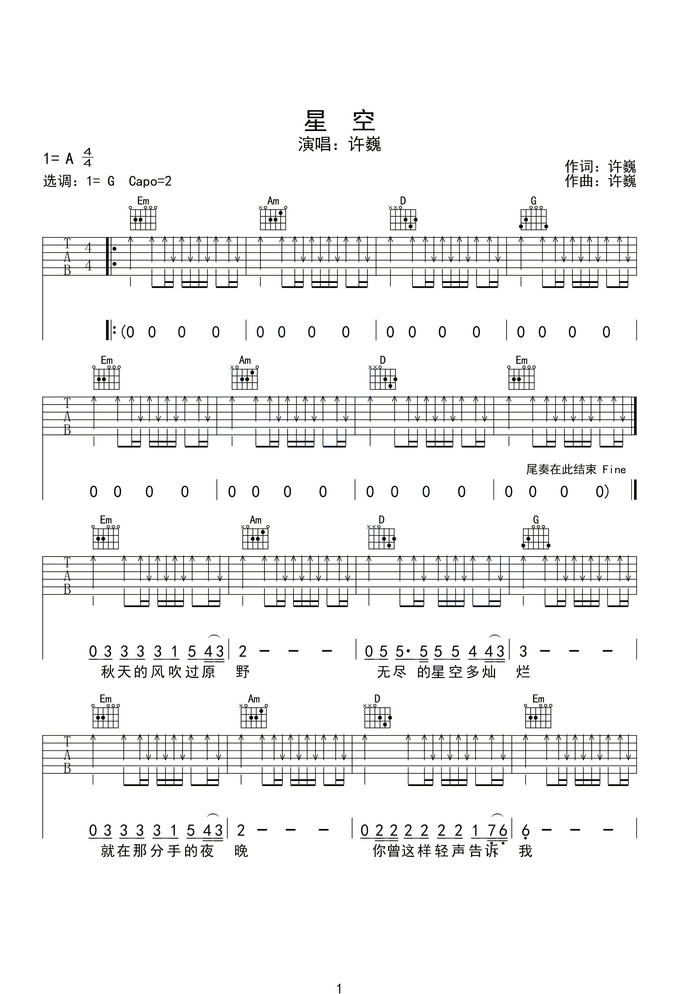 星空吉他谱 - 许巍 - G调吉他弹唱谱