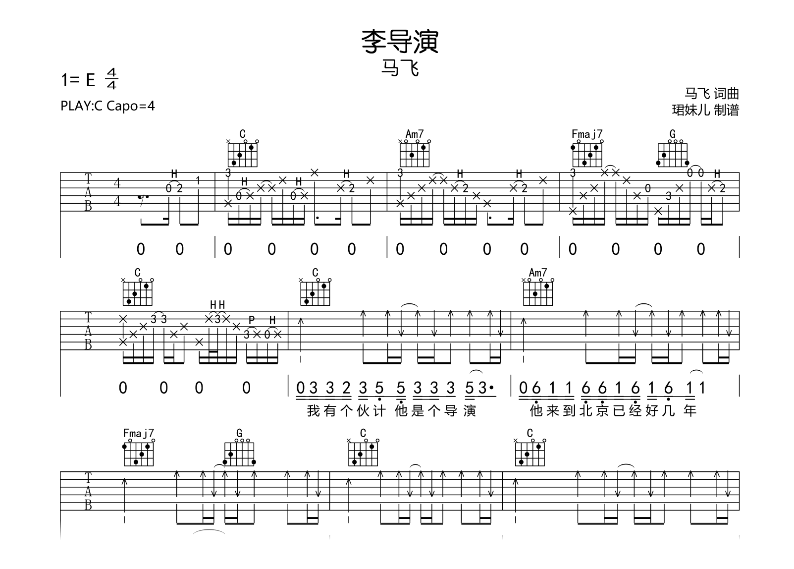 李导演吉他谱 - 马飞 - C调吉他弹唱谱
