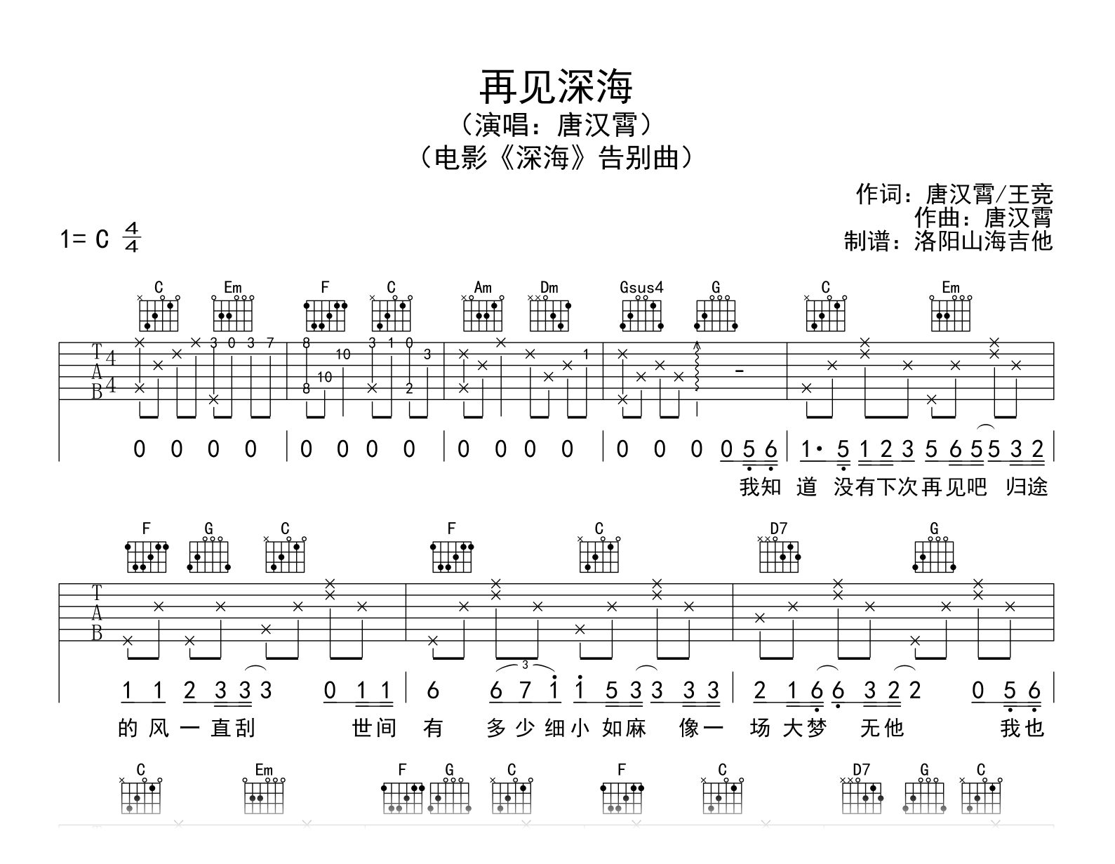 曲谱介绍: 唐汉霄《再见深海》吉他弹唱谱,采用C调指法编配,共有2张高清图谱,免翻页排版设计。