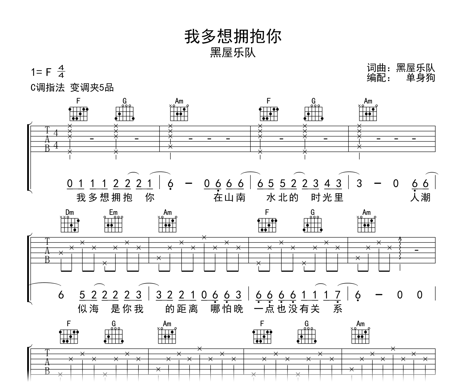 曲谱介绍: 黑屋乐队《我多想拥抱你》吉他弹唱谱,采用C调指法编配,共有2张高清图谱,免翻页排版设计。