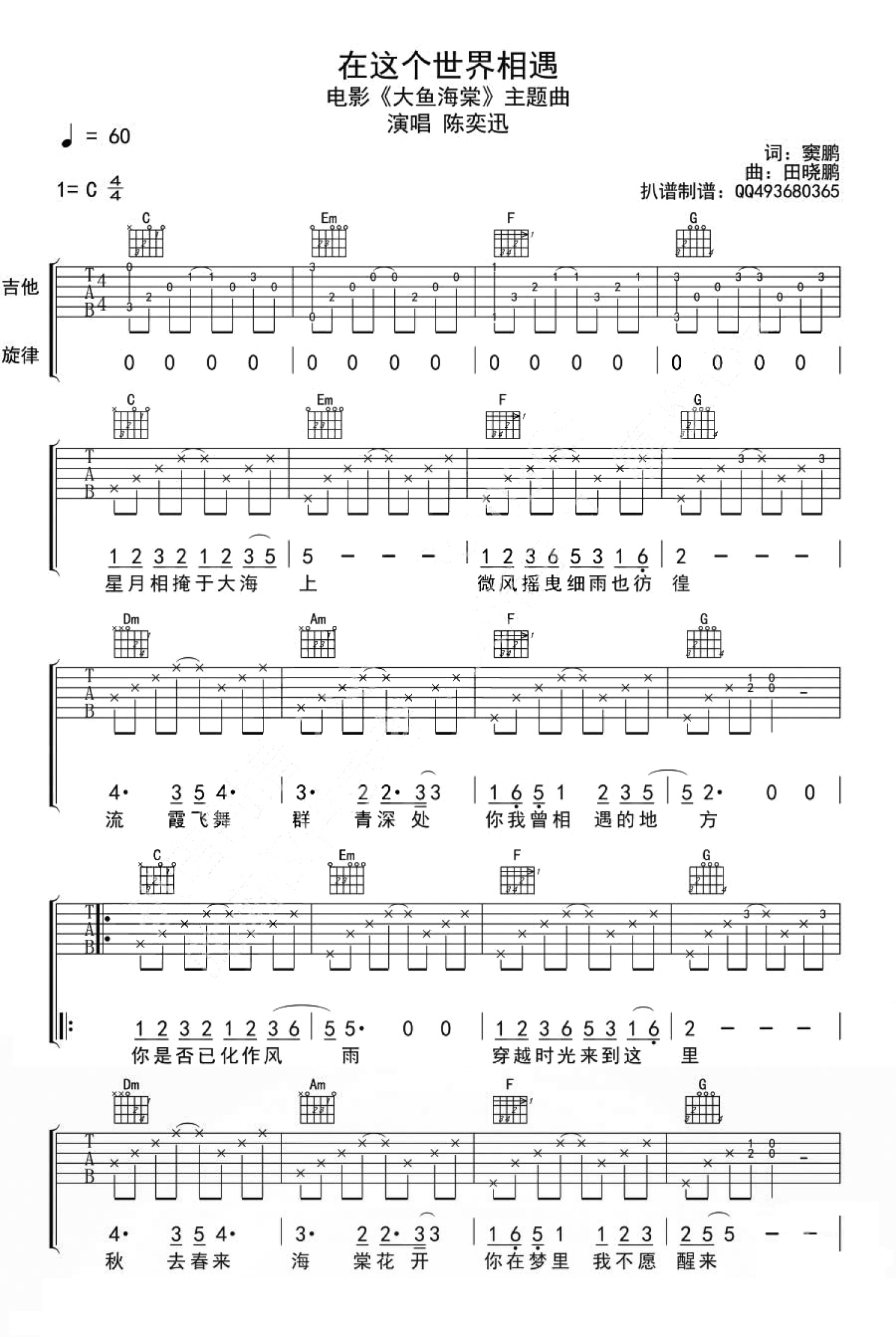 曲谱介绍: 《在这个世界相遇》吉他谱,陈奕迅为电影献唱的主题曲,在这个世界相遇吉他谱,C调六线谱,一首超越了个人情感的桎梏,在天地之间的视角下追寻着人类感情循回往复的偶然和必然。动画电影《大鱼海棠》主题曲从歌名、歌词再到旋律,都深深契合了影片的内核,温情的歌声和充满表现力的情感,无不让人感动。