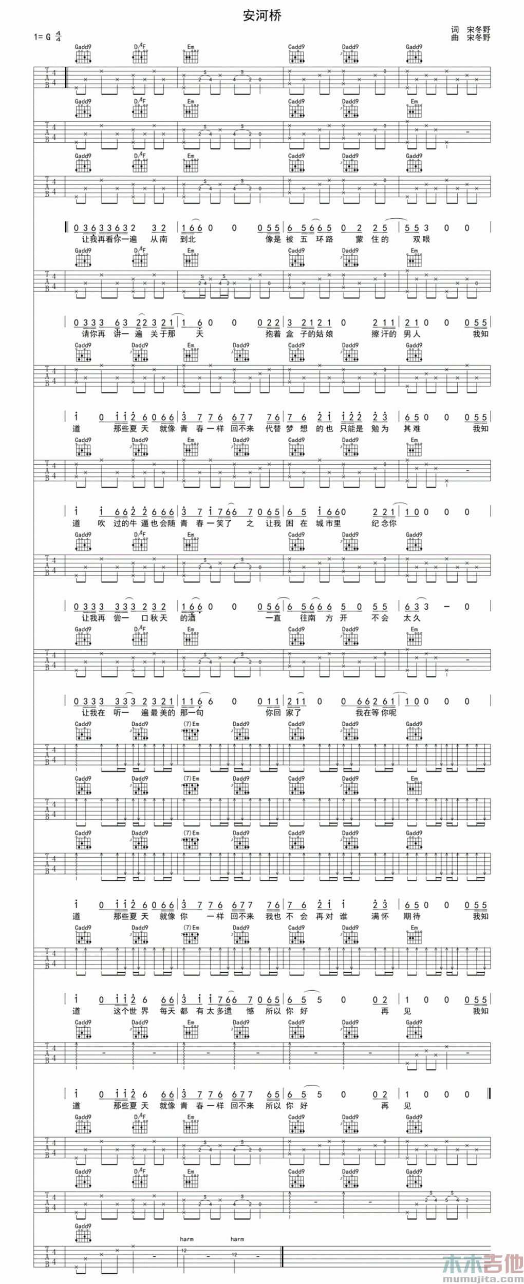 曲谱介绍:   《安和桥》是民谣歌手宋冬野演唱的一首歌曲,由宋冬野作词、作曲,收录在宋冬野2013年发行的专辑《安和桥北》中,是该专辑的主打歌曲。   2013该曲获得2013年”第三届阿比鹿音乐奖“年度单曲奖”。