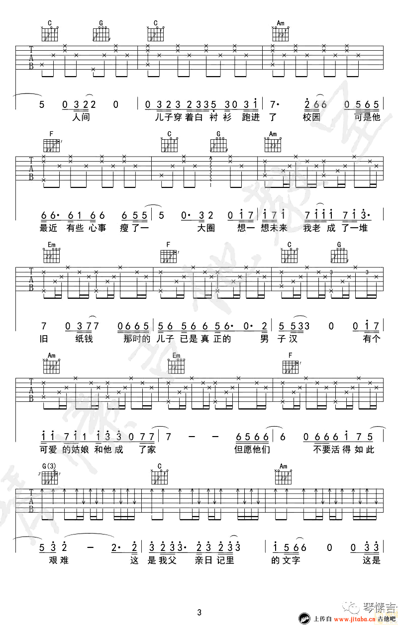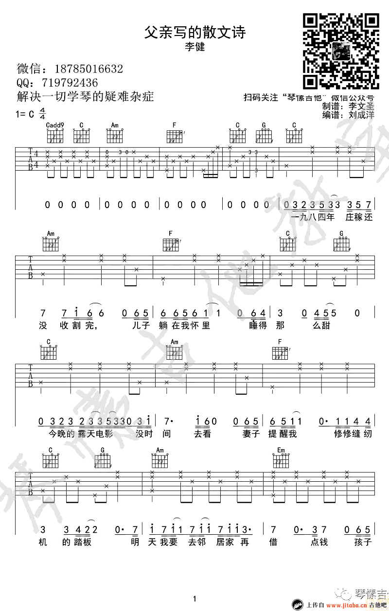 曲谱介绍: 李健《父亲写的散文诗》吉他弹唱谱,采用C调指法编配,共有4张高清图谱。