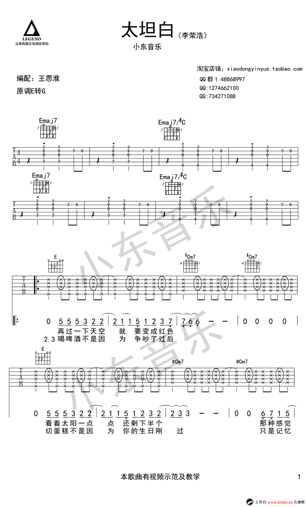 曲谱介绍: 太坦白六线谱,李荣浩演唱,太坦白吉他谱,E转G调,吉他弹唱谱高清版。感谢王思淮编配。一首哀而不伤的情歌,由李荣浩词曲创作,收录在《模特》专辑中。陈奕迅在自己的巡回演唱会曾经翻唱了这首歌。