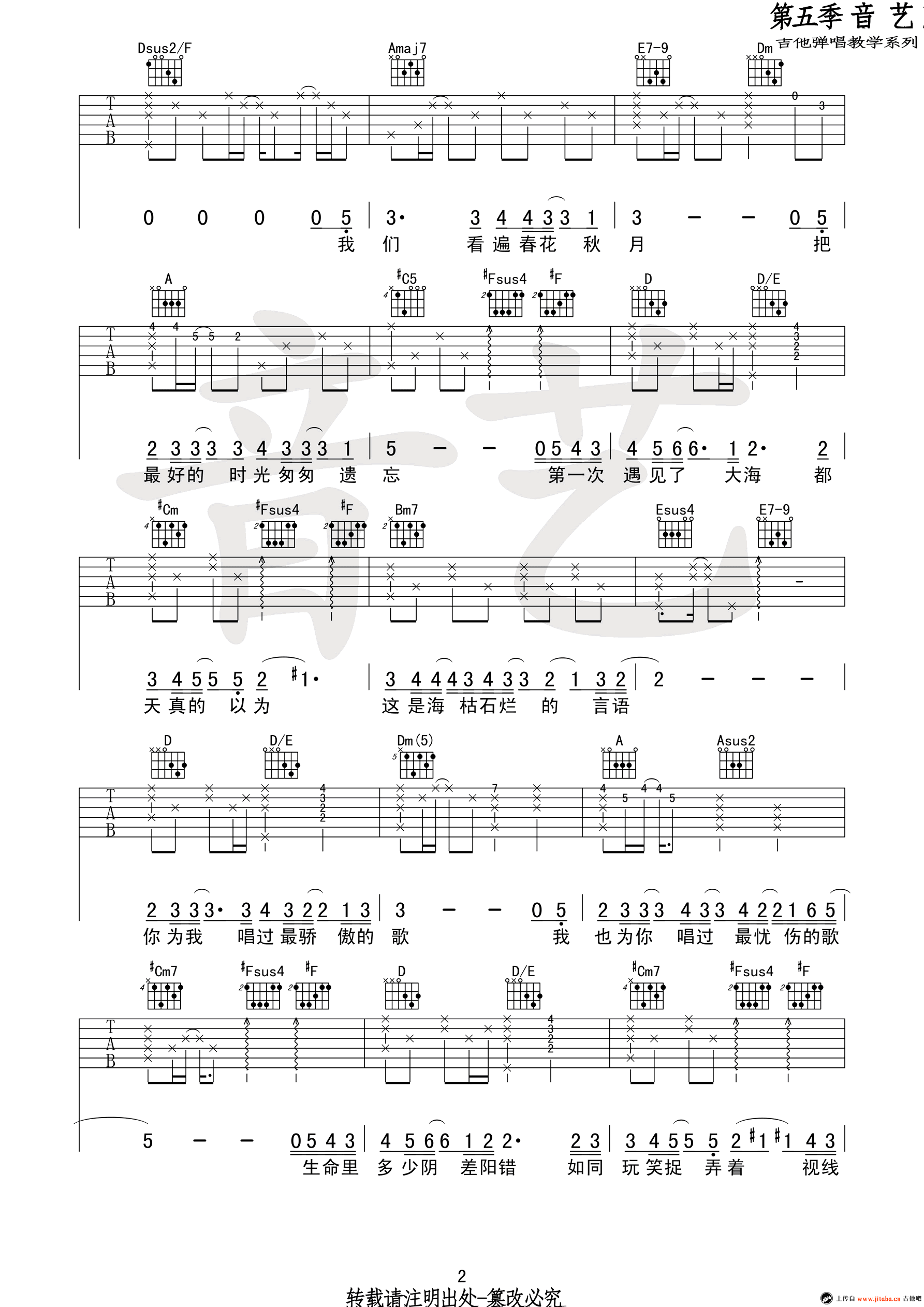 曲谱介绍: 从你的全世界路过吉他谱,原调B调,变调夹夹第二品,选用A调指法。从你的全世界路过六线谱,弹唱谱高清版,感谢音艺吉他教学编配。牛奶咖啡的新歌作品,从你的全世界路过,曾经许下天长地久的诺言,抵不住时光的打磨。命运就像在开玩笑,让你我成为熟悉的陌生人。一起感受这轻缓的旋律,放下那过去的回忆。