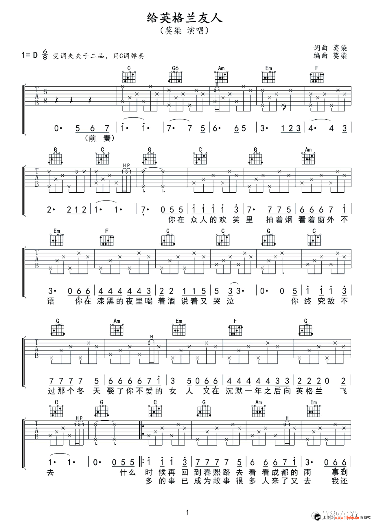 曲谱介绍: 给英格兰友人吉他谱,莫染演唱,给英格兰友人六线谱,变调夹夹于二品,用C调弹奏。本曲谱按照《玖陆拾零》合辑中正式版的吉他编配制作,在实际弹奏中不必拘泥谱面,可以在和弦与节奏正确的基础上自由发挥。注意6/8拍的节奏律动。前奏与间奏在录音版本中使用到口风琴,现场弹唱演出中则使用的是口琴。本吉他谱由莫染工作室制作,欢迎传播。