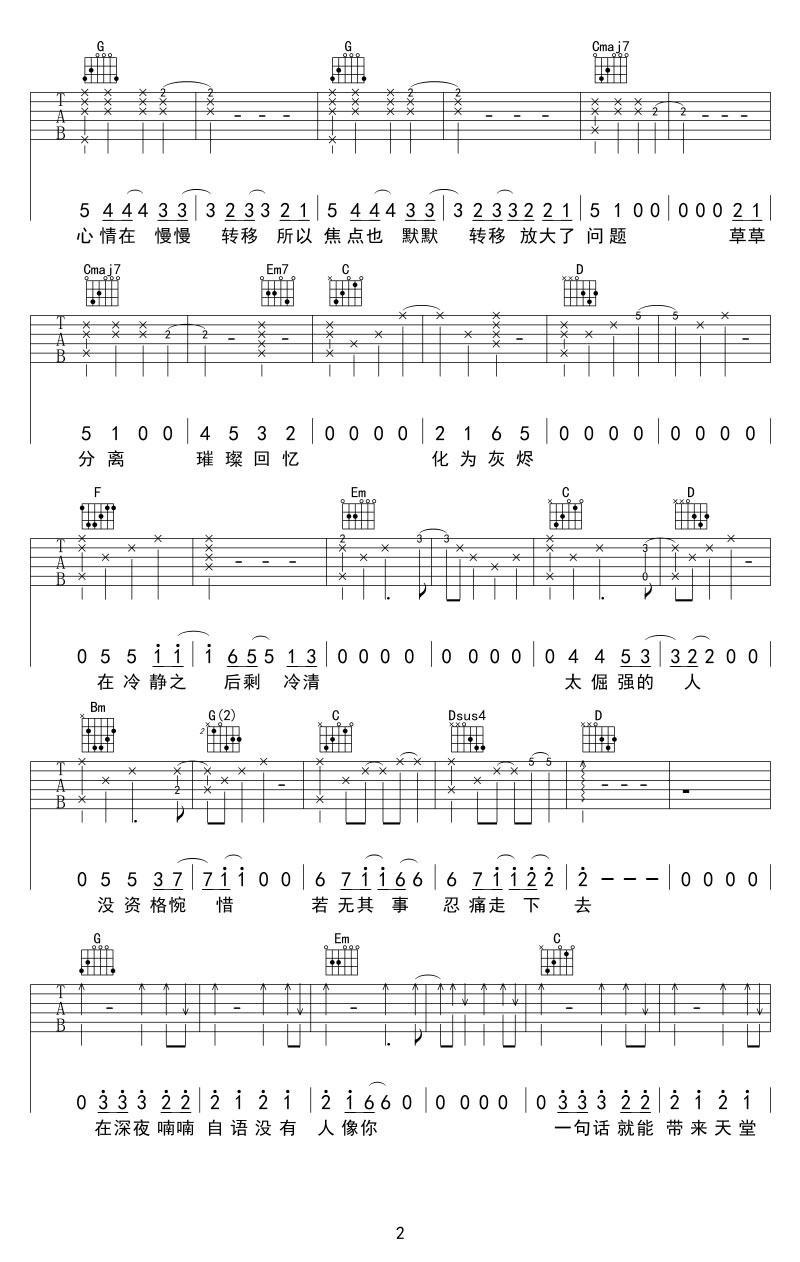 曲谱介绍: 梁静茹没有人像你吉他谱,G调指法,没有人像你吉他六线谱,完整版共六张图片谱例。这首歌曲收录于梁静茹《爱久见人心》专辑。每段故事都有剧情,每段爱情都是动人旋律,但是都会有句点。你是窗外另外一片风景,在你眼里,我是什么关系? 我们在爱情里把自己定位成怎样的角色?我还可以那样任性地继续做自己吗?