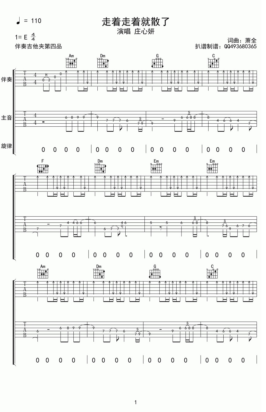 曲谱介绍: 庄心妍演唱《走着走着就散了》吉他谱,双吉他六线谱编配,E调,伴奏吉他夹四品。走着走着就散了吉他谱,完整版共七张图片谱例分成两页呈现;生命中的那些人,走着走着就散了;曾经的那个自己,走着走着就丢了。多数时间我们都忙忙碌碌的来不及伤春悲秋,只是当那时爱听的歌再一次响起时,就忍不住会回想。这样的旋律会把一首悲伤的歌词诠释的很果敢,人和人真的就像歌词里写的那样,有些时候走着走着就散了,无论是朋友还是恋人。