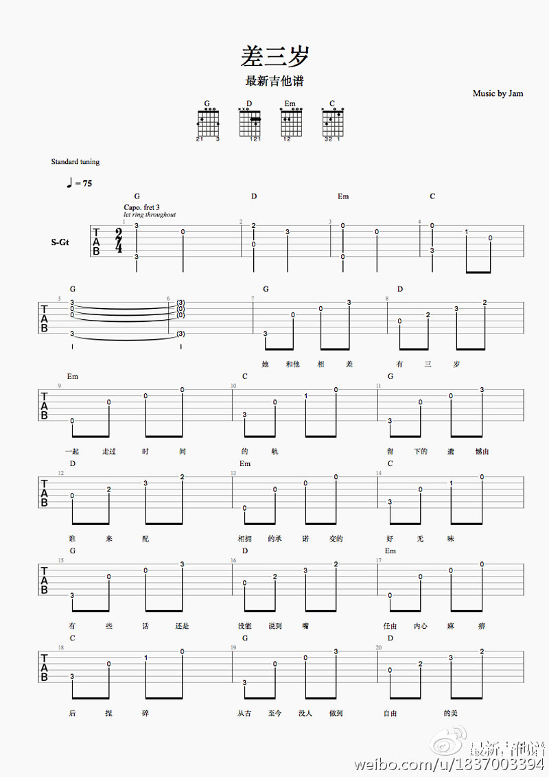 曲谱介绍: Jam差三岁吉他谱,G调,Capo3品TAB图片谱。Jam阿敬民谣歌曲创作演唱《差三岁》吉他谱,完整版共五张图片谱例,两页展示。民谣能打动我们的地方很重要的是它里面的故事,喜欢有着不疾不徐的干净嗓音的歌者,这样安安静静女子,带着青涩,弹着吉他,唱着民谣,说着故事。