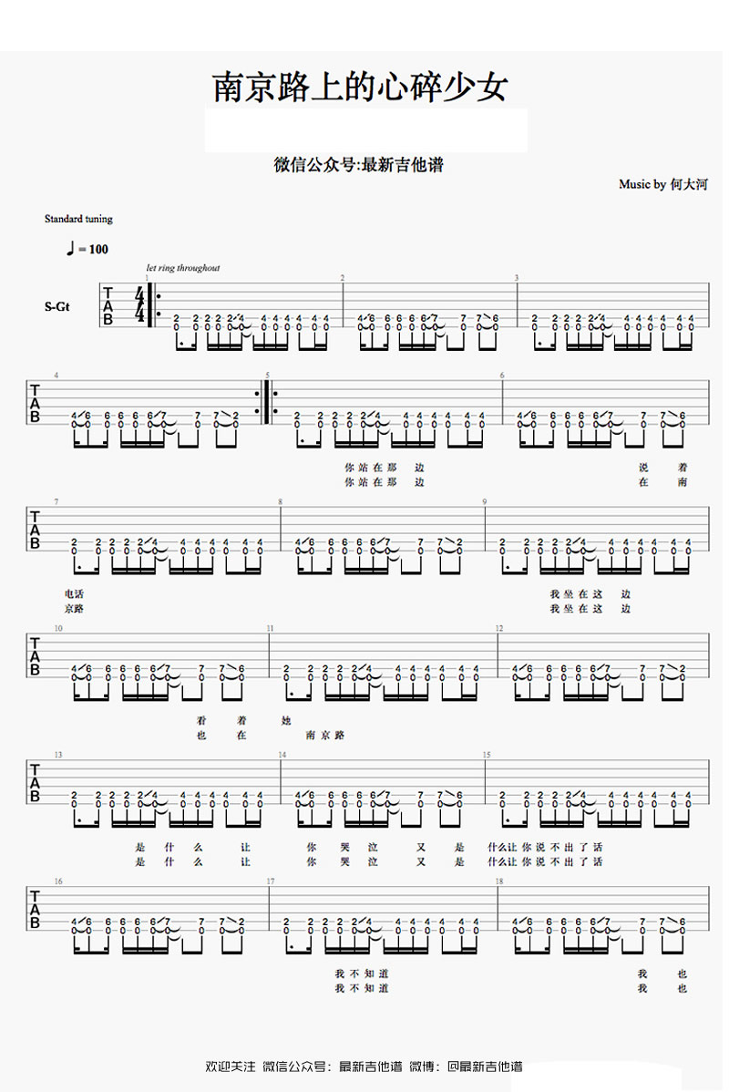曲谱介绍: 何大河《南京路上的心碎少女》吉他谱,六线谱完整版,四张图片谱两页呈现。最新吉他谱编配。民谣到底是什么呢?对我来说就是一个人唱着自己的心事和故事,你听着一句一下子打在了心坎儿那就是有缘分了。我的世界里没有南京路也没有一杯酒就解了的愁,但是一切就算了吧,做为一个年轻人,路真的很长,有些事就是如此不堪。
