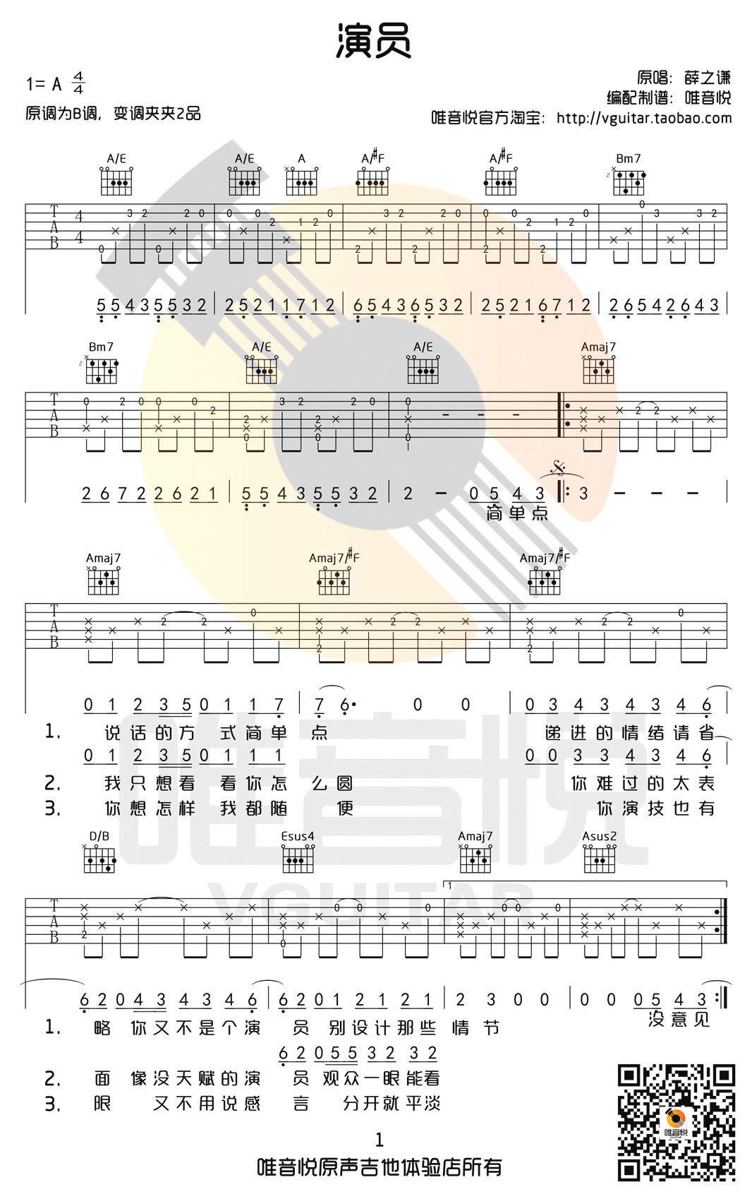 演员吉他谱 - 薛之谦 - A调吉他弹唱谱