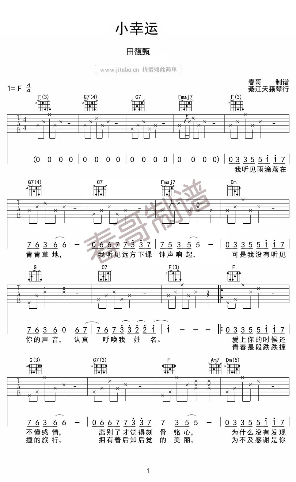 曲谱介绍: 田馥甄小幸运吉他谱,F调指法编配,小幸运吉他六线谱,图片谱高清版,四张谱例两页呈现。电影《我的少女时代》主题曲,田馥甄演唱的一首勾起青春回忆的歌曲。声线淡淡的诠释了青春时少女的心事,错过的失去的都是最难以忘怀的记忆。感谢天籁琴行春哥编配。