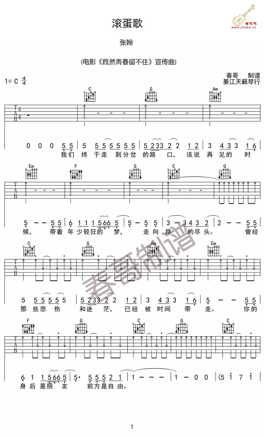 曲谱介绍: 张翰滚蛋歌吉他谱,C调指法六线谱,滚蛋歌吉他弹唱谱,电影《既然青春留不住》宣传曲,留不住的是青春,留得住的是回忆,歌词暖心励志,充满青春正能量,旋律魔性十足的歌曲,滚蛋歌吉他谱,共五张高清图片谱例,分两页呈现,感谢天籁琴行春哥制谱。