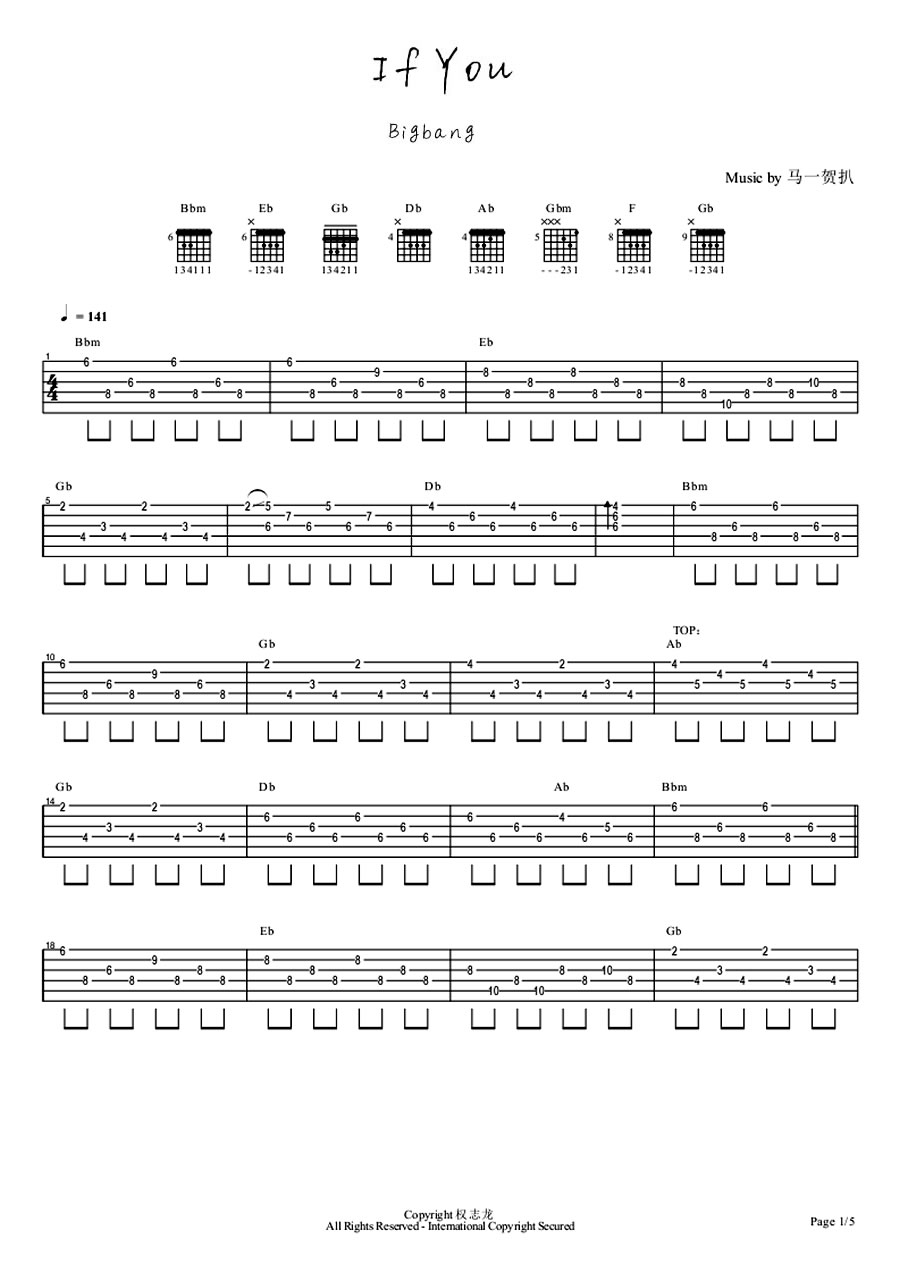 曲谱介绍: Bigbang if you吉他谱,六线谱编配,四张图片谱。Bigbang if you用最直白的歌词,抒情的旋律唱出了那些面对最爱离开时无能为力,忧伤的曲调仿佛有一股安静的力量灌入身体里,让躁动的心都平静下来。if you的基调偏冷,安心,感动,如bigbang一贯的风格,夹杂着悲伤,孤独,但一定不会很浓烈。简单的旋律深入人心,不是迎合市气的喧闹舞曲,不是矫揉做作的抒情歌曲。