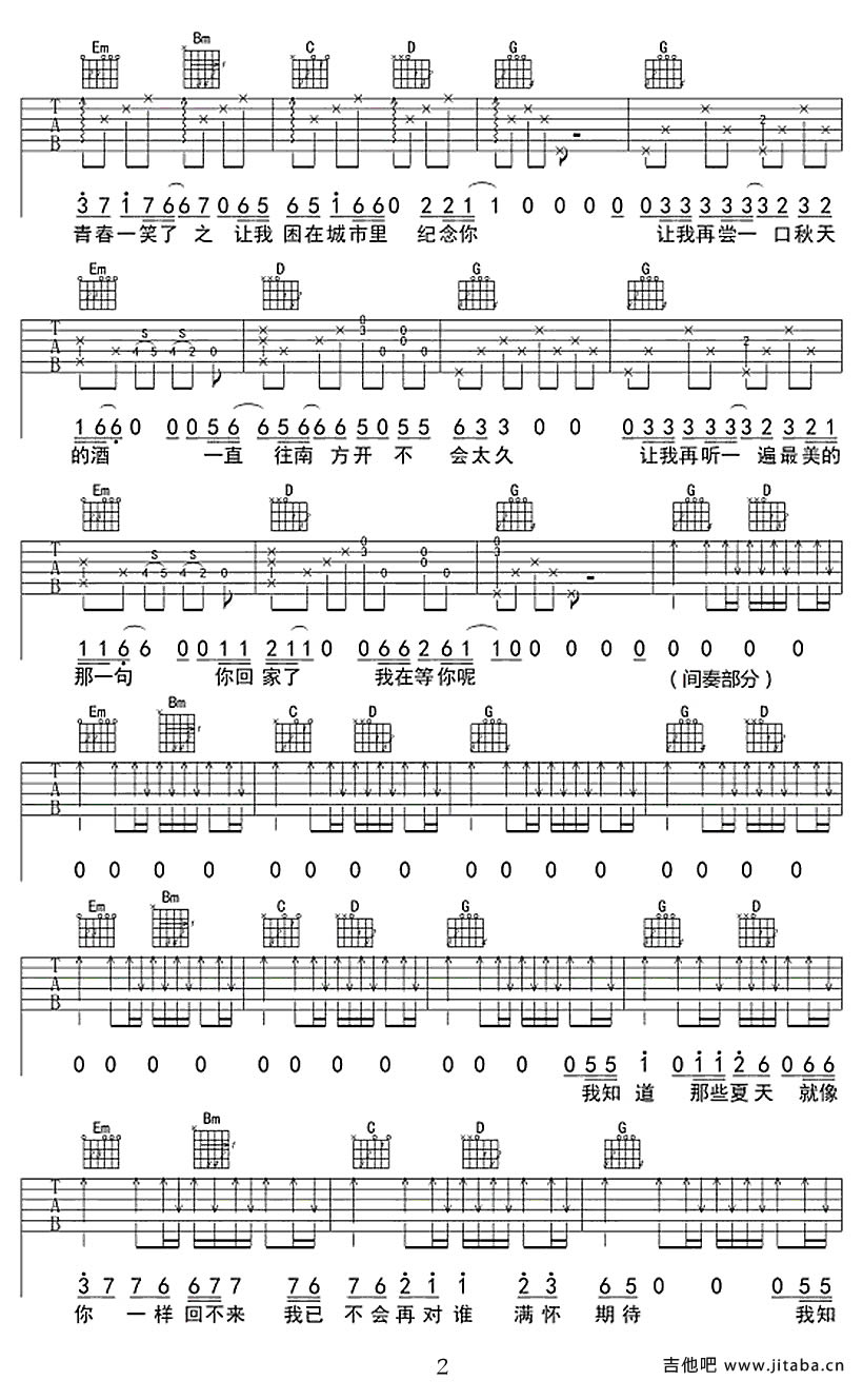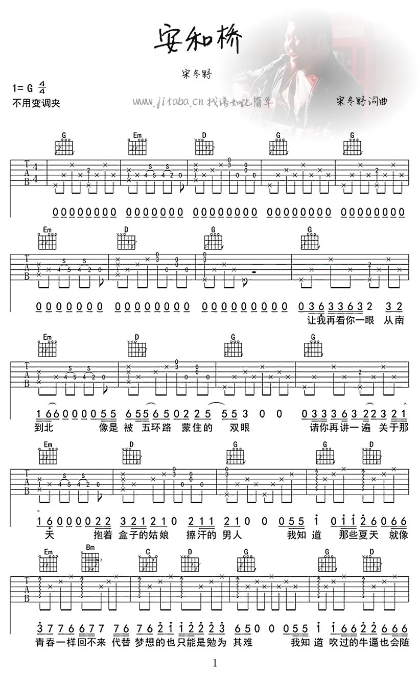 曲谱介绍: 宋冬野安和桥吉他谱,G调指法不用变调夹,安河桥吉他弹唱谱,六线谱图片格式。鼓声咚咚,人生悠悠。嘶哑的男声唱出离别的伤感。青春是梦想的温床,夏天是离别的季节。生活在这个平凡的都市里,它有许多我们难以放下和忽略的东西,已经习惯步行街热闹的人潮,拥挤的车流,掺杂了烟酒的笑颜,可是最终我们需要的只是一首简单的旋律。