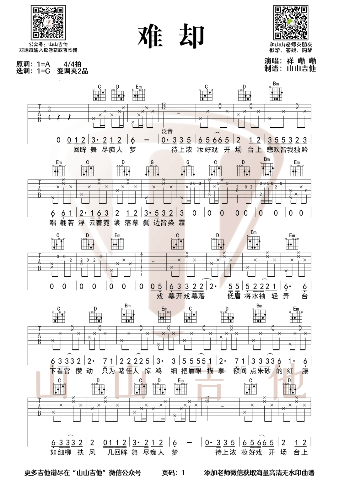 曲谱介绍: 吉他谱介绍:难却吉他谱,祥嘞嘞演唱的一首歌曲,4/4拍的节奏,这首歌曲的原调为A调,这里曲谱采用了G调指法进行编配,演唱时夹变调夹2品可回到原调,也可根据个人实际嗓音情况选择。曲谱由琴谱网更新上传,共2张高清图片弹唱吉他谱例,来源于@山山吉他编配出品。