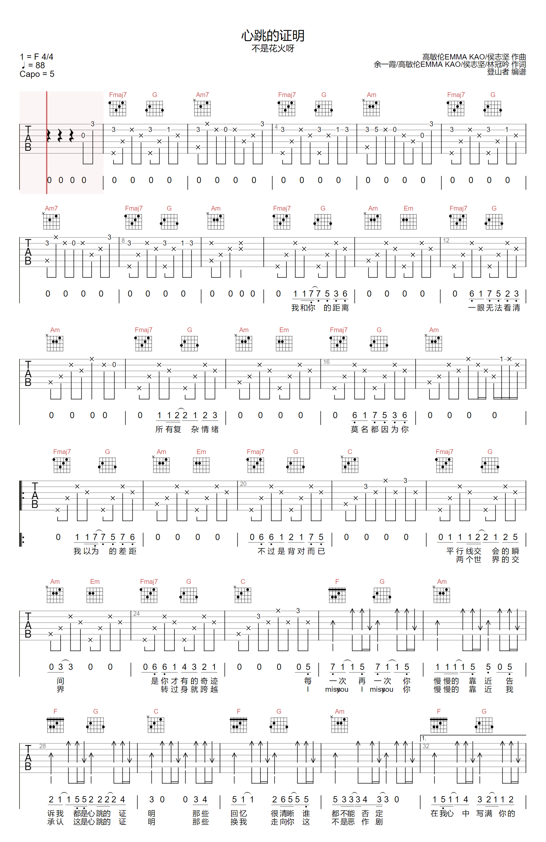 曲谱介绍: 吉他谱介绍:心跳的证明吉他谱,不是花火呀演唱的一首歌曲,4/4拍的节奏,这首歌曲的原调为F调,这里曲谱采用了C调指法进行编配,演唱时夹变调夹5品可回到原调,也可根据个人实际嗓音情况选择。曲谱由琴谱网更新上传,共2张高清图片弹唱吉他谱例,来源于@登山者编配出品。