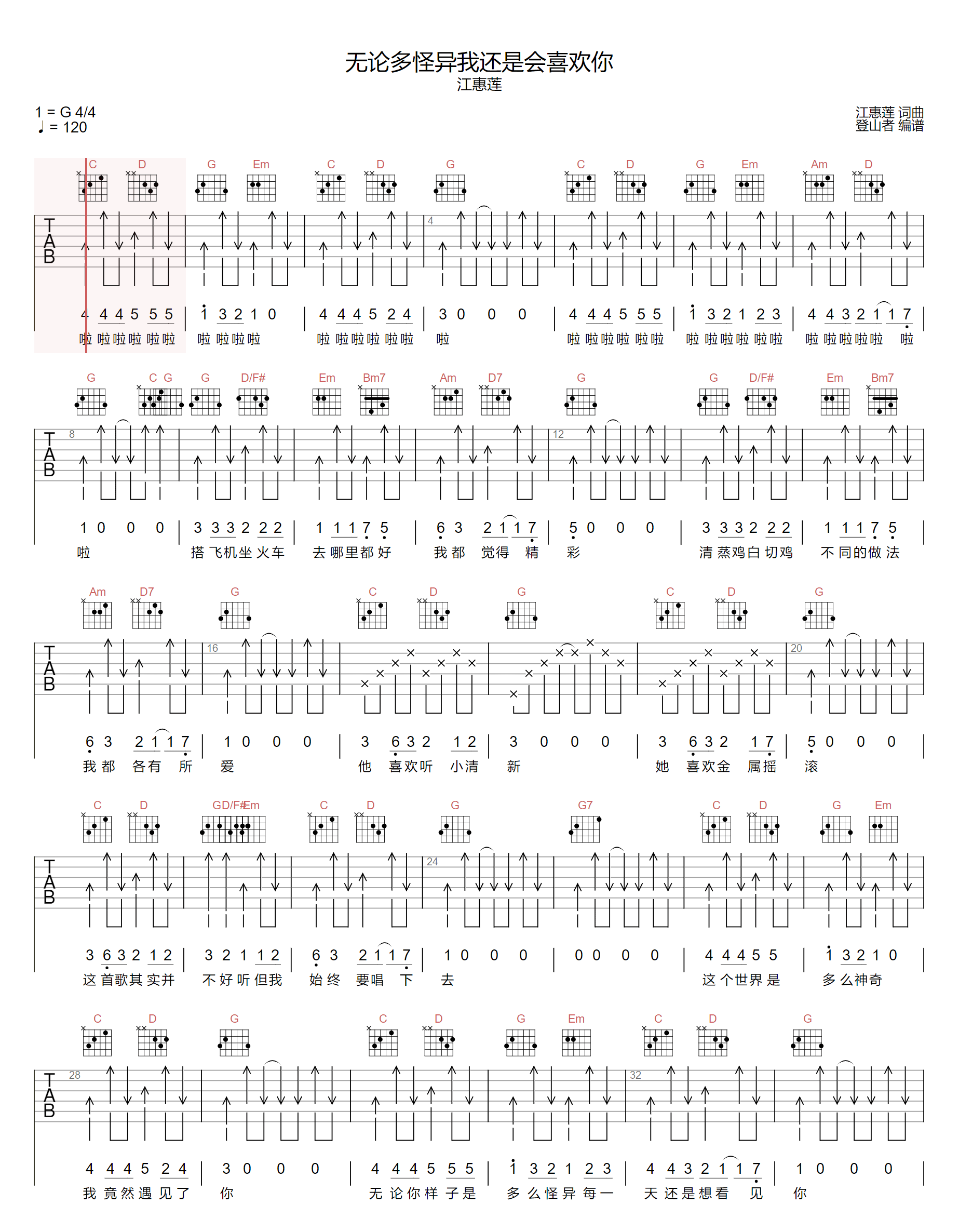 无论多怪异我还是会喜欢你吉他谱 - 江惠莲 - G调吉他弹唱谱