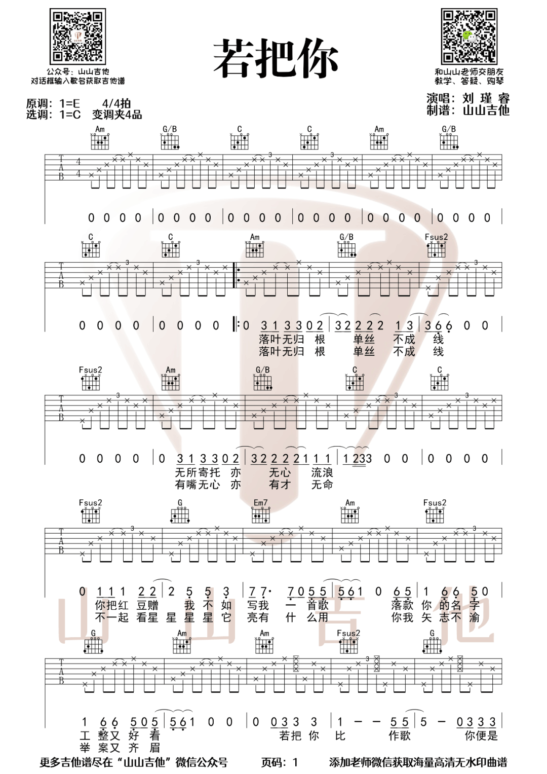 曲谱介绍: 吉他谱介绍:若把你吉他谱,刘瑾睿演唱的一首歌曲,4/4拍的节奏,这首歌曲的原调为E调,这里曲谱采用了C调指法进行编配,演唱时夹变调夹4品可回到原调,也可根据个人实际嗓音情况选择。曲谱由琴谱网更新上传,共2张高清图片弹唱吉他谱例,来源于@山山吉他编配出品。在刘瑾睿的歌词里,她隐隐地认为,送红豆来表达含蓄的爱意,其实已经过时了,在音乐的时代,送给我一首国风的歌,或许更能让我笑逐颜开。
