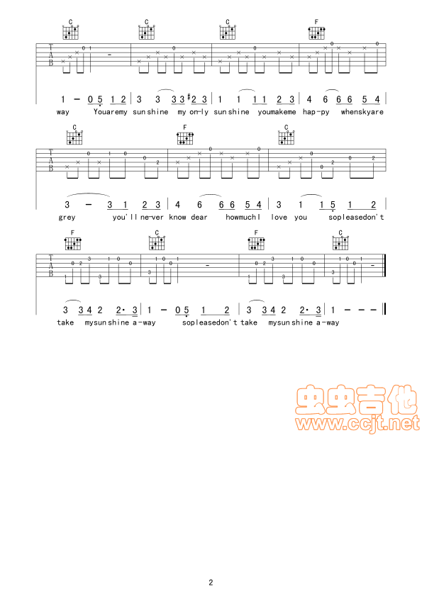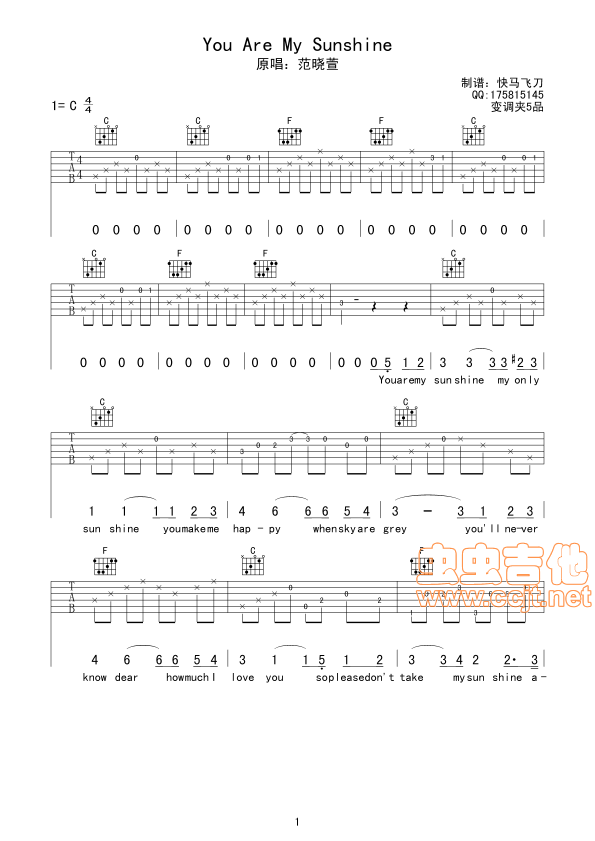 曲谱介绍: 范晓萱《YouAreMySunshine》吉他弹唱谱,共有2张高清图谱,免翻页排版设计。