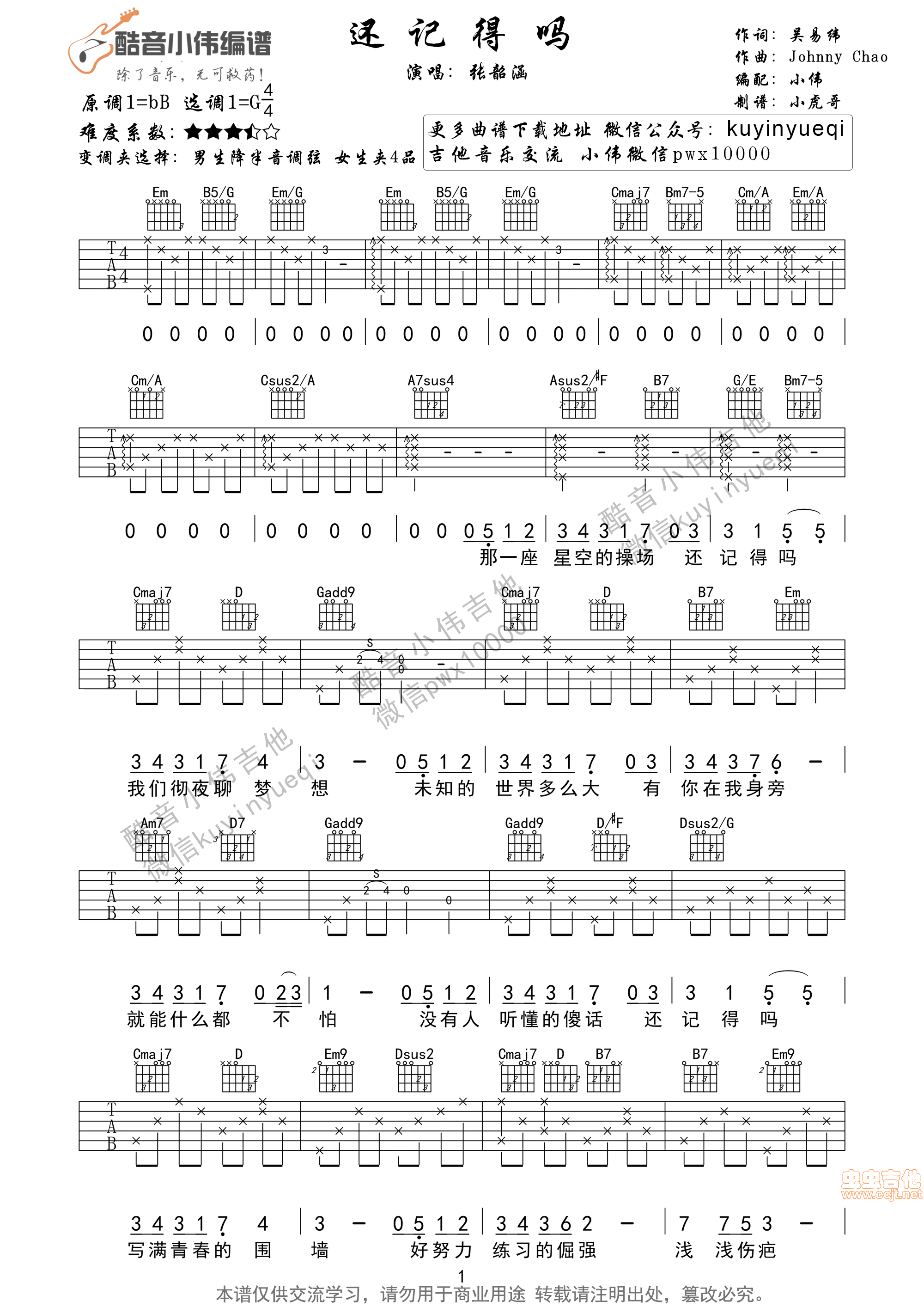 曲谱介绍: 《还记得吗》吉他弹唱谱,共有3张高清图谱。